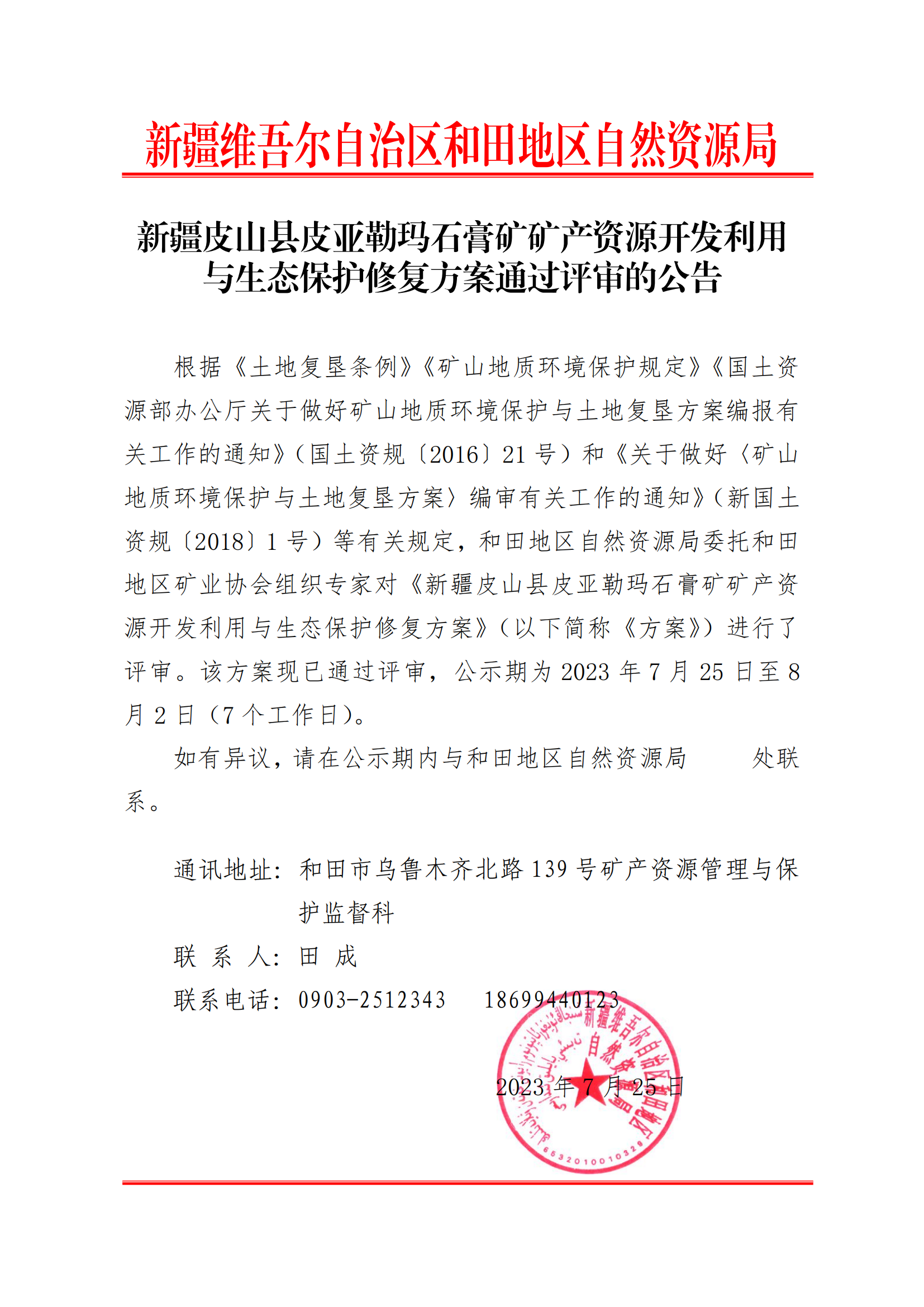 新疆皮山縣皮亞勒瑪石膏礦礦產(chǎn)資源開發(fā)利用與生態(tài)保護修復(fù)方案通過評審的報告