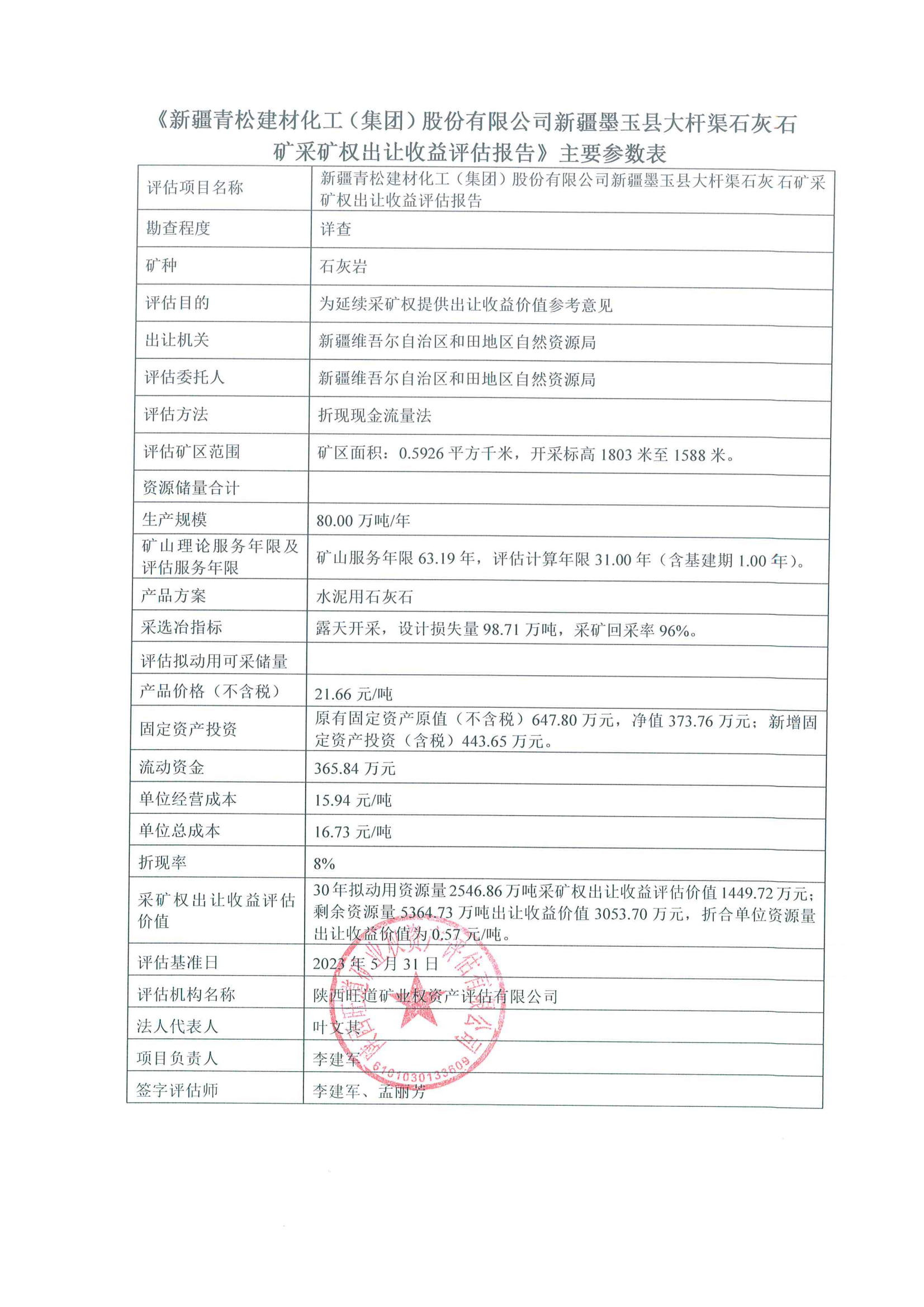 《新疆青松建材化工(集團(tuán))股份有限公司新疆墨玉縣大桿渠石灰石礦采礦權(quán)出讓收益評(píng)估報(bào)告》主要參數(shù)表