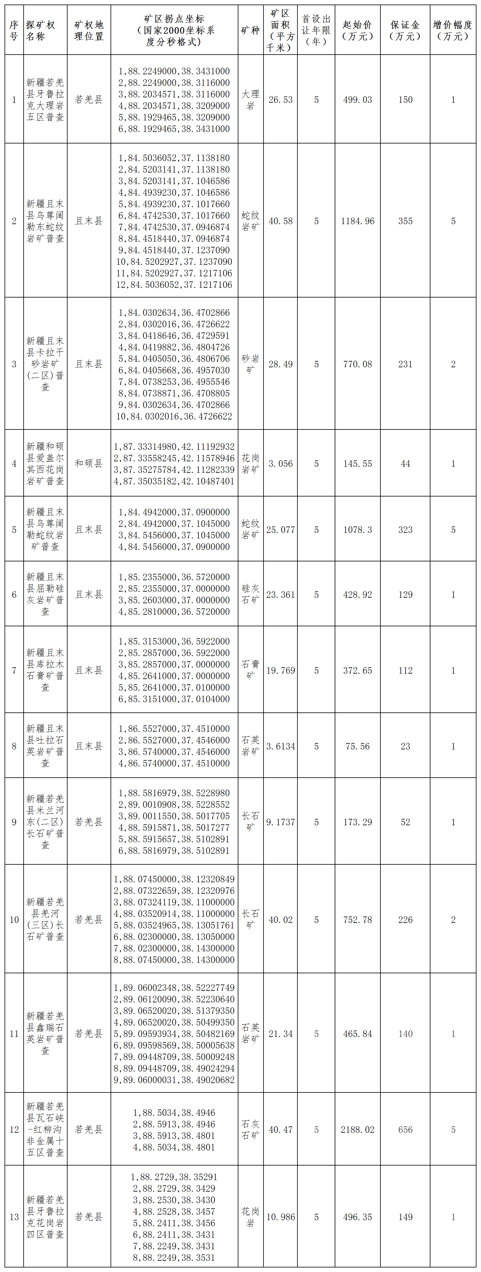 根據(jù)《中華人民共和國(guó)礦產(chǎn)資源法》、《礦產(chǎn)資源勘查區(qū)塊登記管理辦法》、《自然資源部關(guān)于印發(fā)礦業(yè)權(quán)出讓交易規(guī)則的通知》(自然資規(guī)〔2023〕1號(hào) )、《新疆維吾爾自治區(qū)礦產(chǎn)資源管理若干事項(xiàng)暫行辦法》(新自然資規(guī)〔2021〕1號(hào))和《關(guān)于規(guī)范政務(wù)服務(wù)和公共資源交易中心收費(fèi)項(xiàng)目和標(biāo)準(zhǔn)的通知》(新發(fā)改服價(jià)〔2020〕578號(hào))等有關(guān)法律法規(guī)和政策規(guī)定,巴州政務(wù)服務(wù)和公共資源交易中心受巴州自然資源局委托,對(duì)新疆若羌縣牙魯拉克大理巖五區(qū)普查等13個(gè)探礦權(quán)以掛牌方式公開(kāi)出讓,現(xiàn)將有關(guān)事項(xiàng)公告如下: