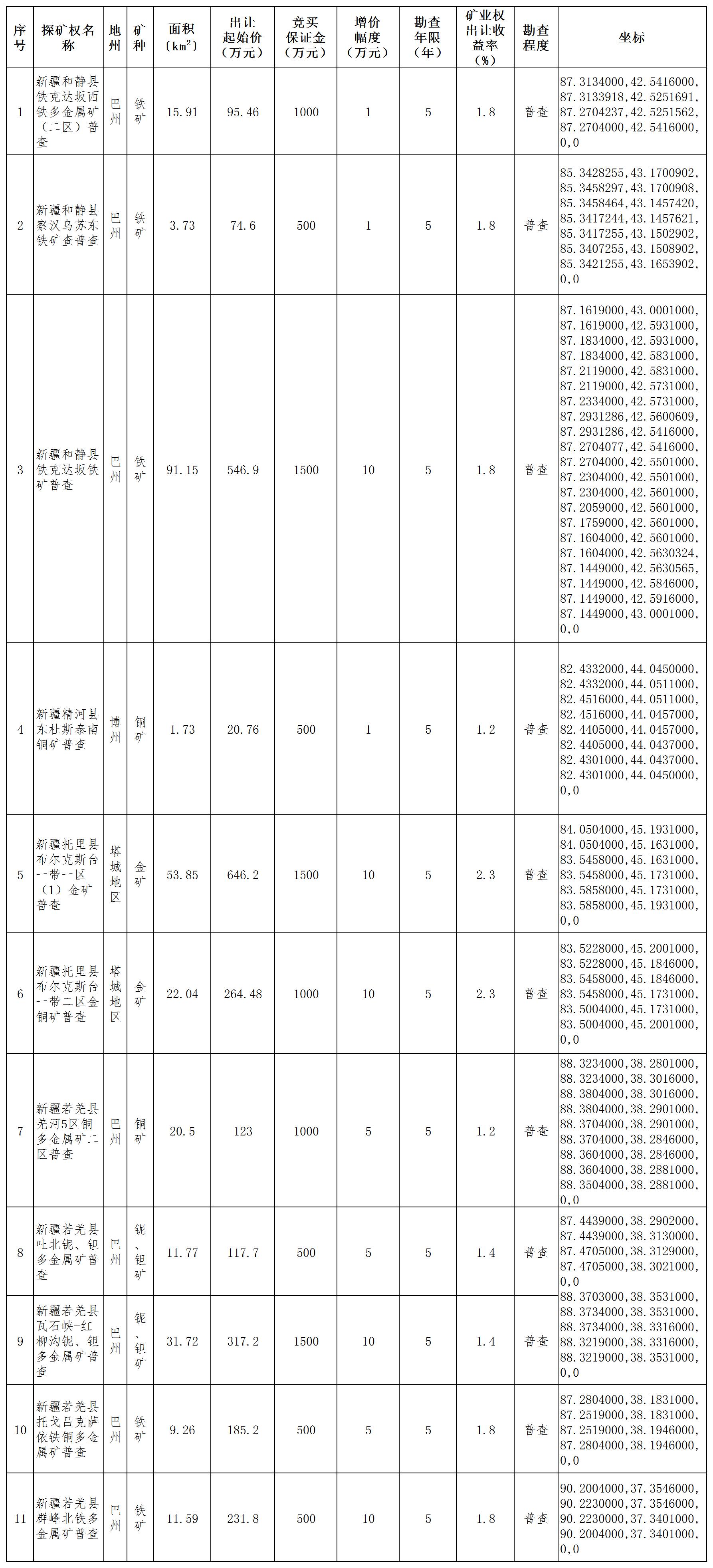 出讓探礦權(quán)名稱、面積、拐點坐標、掛牌起始價、增價幅度等基本情況(見附件1)。