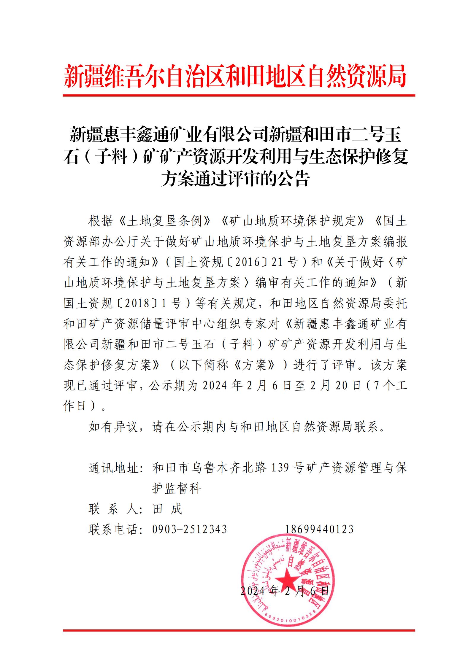 新疆惠豐鑫通礦業(yè)有限公司新疆和田市二號玉 石(子料)礦礦產(chǎn)資源開發(fā)利用與生態(tài)保護修復方案通過評審的公告