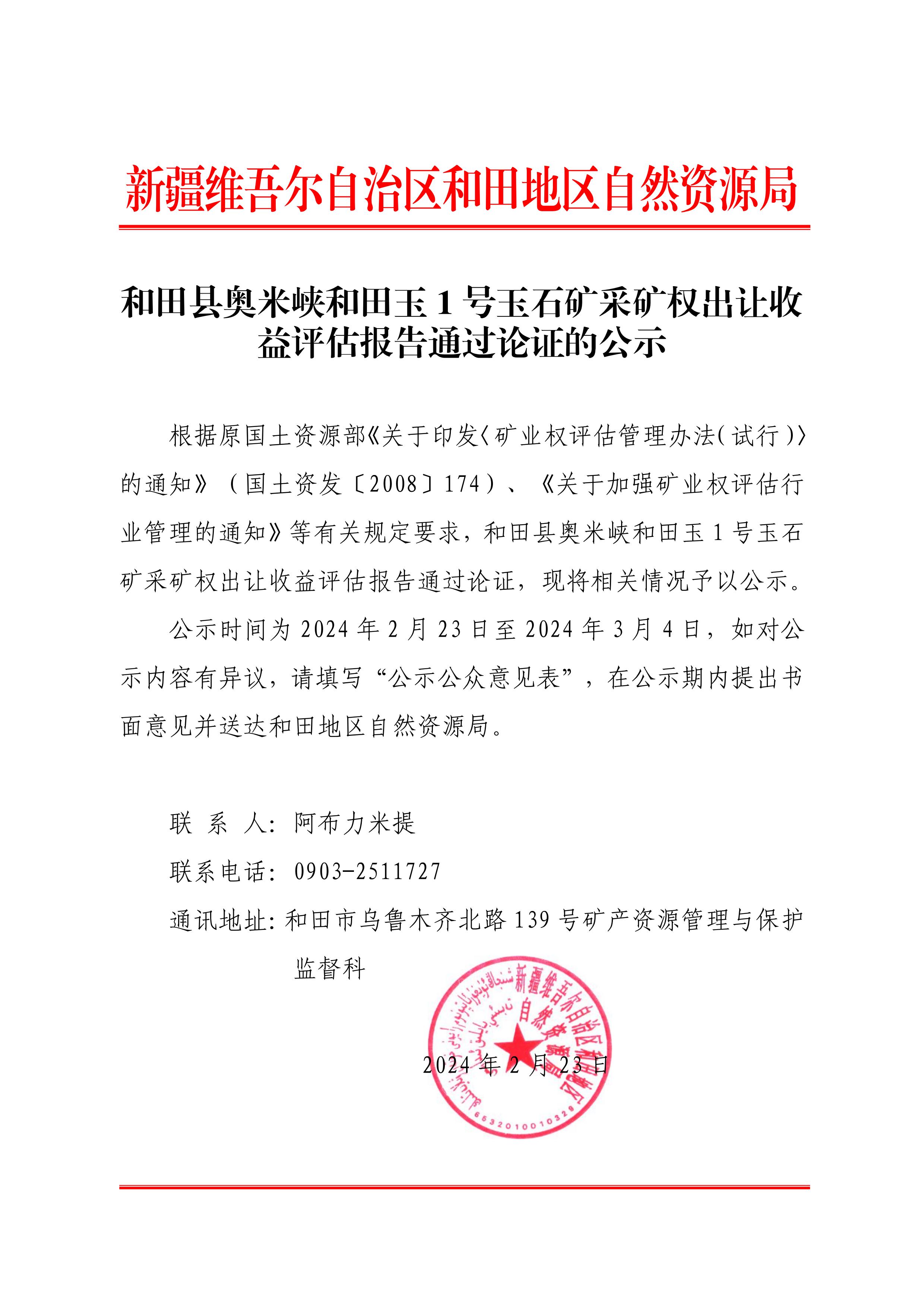 和田縣奧米峽和田玉 1 號(hào)玉石礦采礦權(quán)出讓收益評(píng)估報(bào)告通過論證的公示