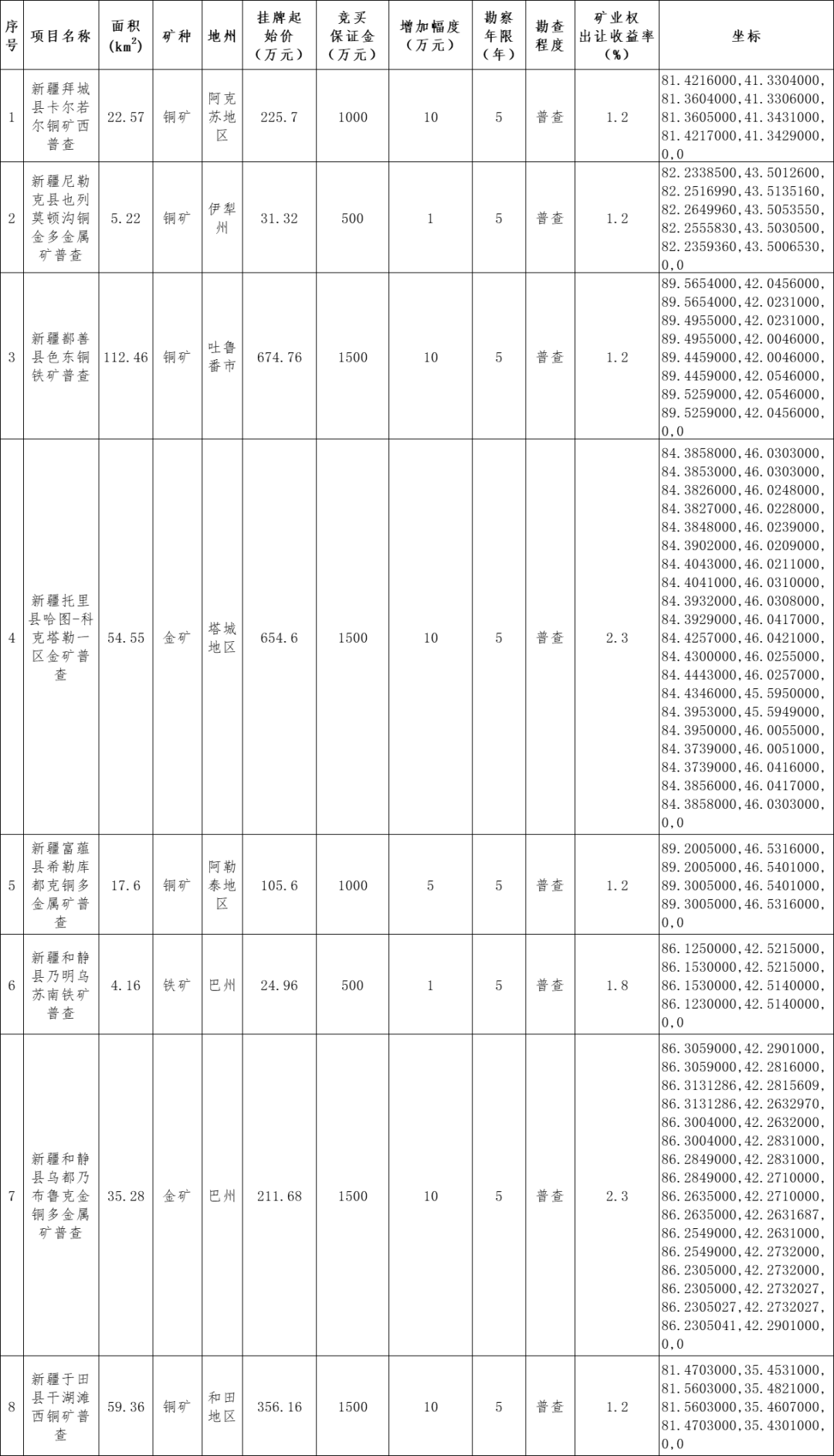為促進(jìn)礦產(chǎn)資源勘查開采,按照相關(guān)法律法規(guī)的規(guī)定,經(jīng)自治區(qū)人民政府批準(zhǔn),受自治區(qū)自然資源廳委托,新疆維吾爾自治區(qū)政務(wù)服務(wù)和公共資源交易中心(以下簡(jiǎn)稱交易中心)以掛牌方式出讓新疆拜城縣卡爾若爾銅礦西普查等8個(gè)探礦權(quán)?,F(xiàn)將有關(guān)事項(xiàng)公告如下: