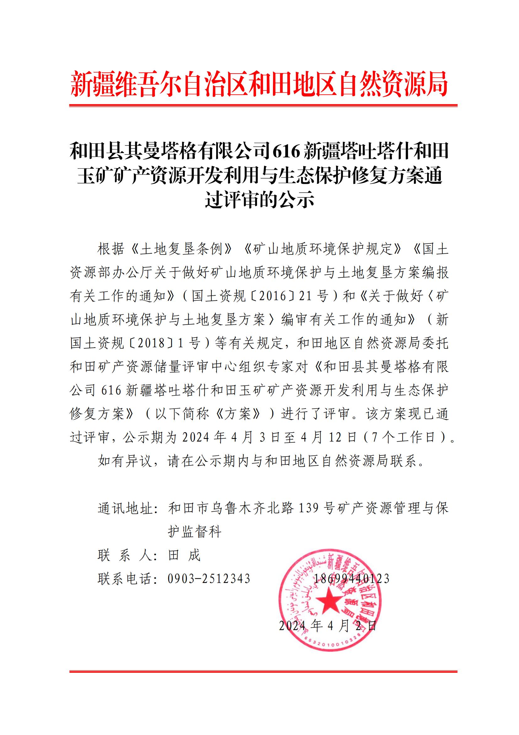 和田縣其曼塔格有限公司616新疆塔吐塔什和田玉礦礦產(chǎn)資源開發(fā)利用與生態(tài)保護(hù)修復(fù)方案通過評(píng)審的公示