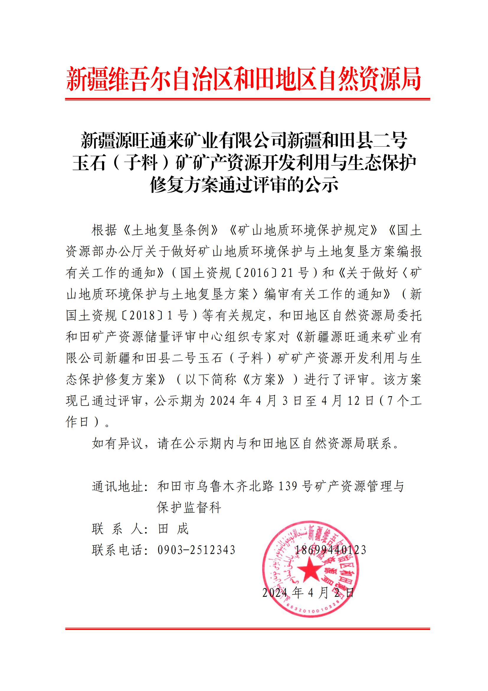 新疆源旺通來礦業(yè)有限公司新疆和田縣二號(hào)玉石(子料)礦礦產(chǎn)資源開發(fā)利用與生態(tài)保護(hù)修復(fù)方案通過評(píng)審的公示