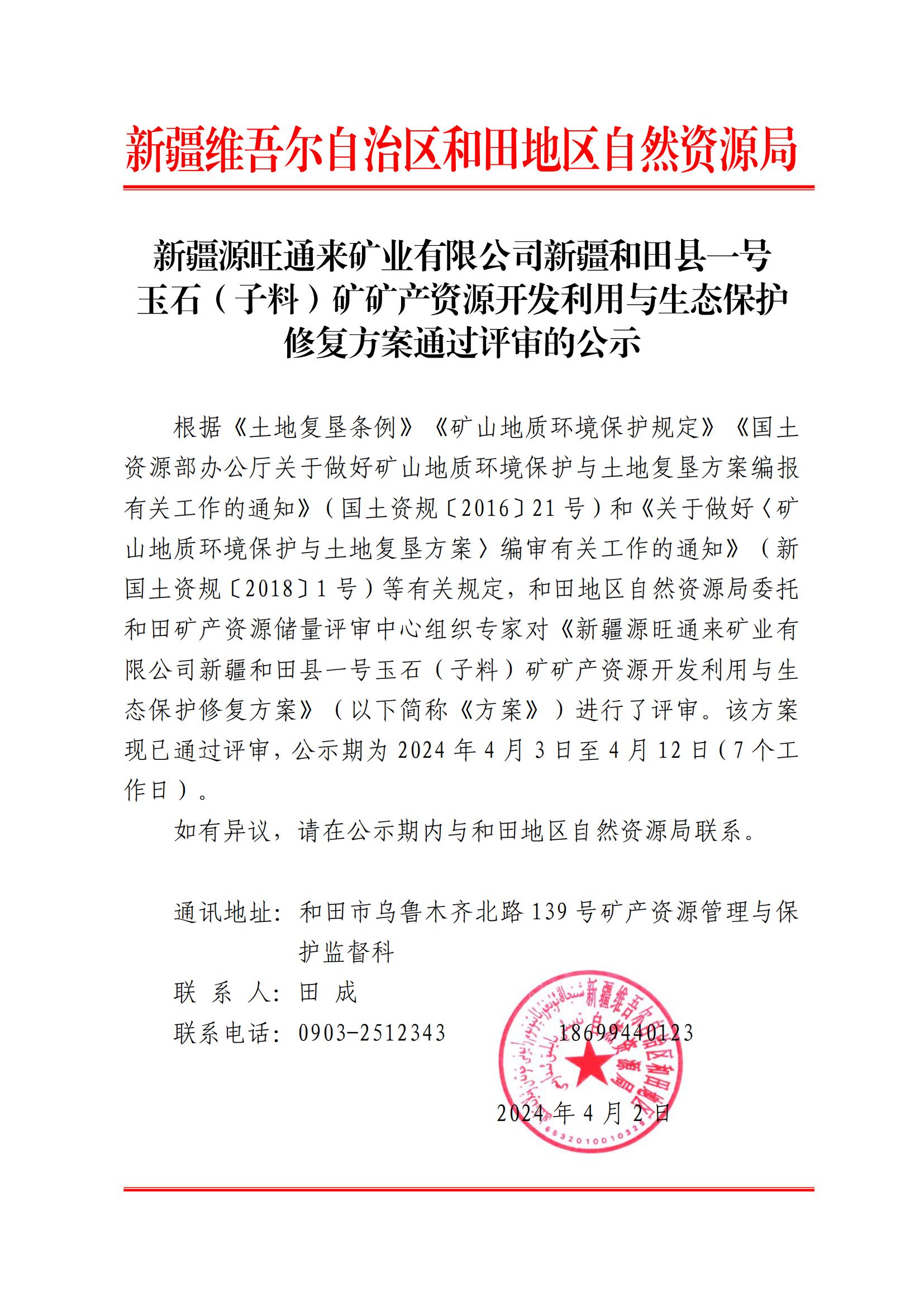 新疆源旺通來礦業(yè)有限公司新疆和田縣一號玉石(子料)礦礦產(chǎn)資源開發(fā)利用與生態(tài)保護修復(fù)方案通過評審的公示