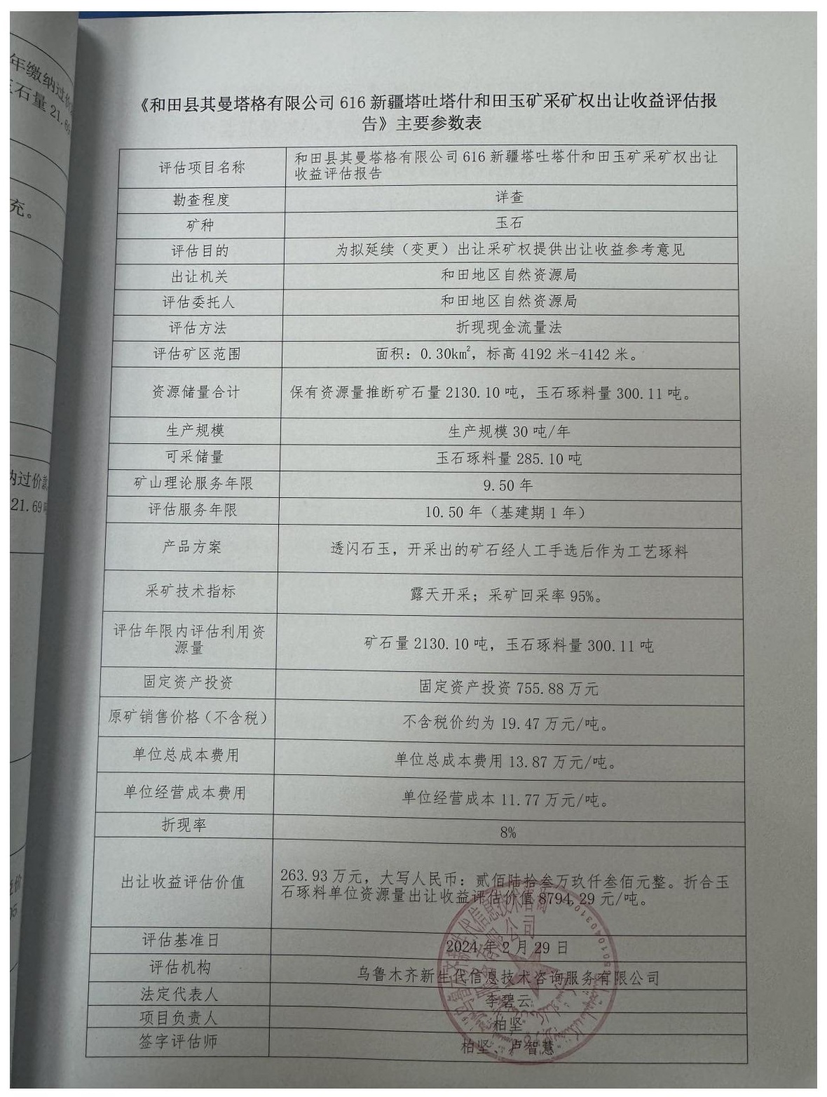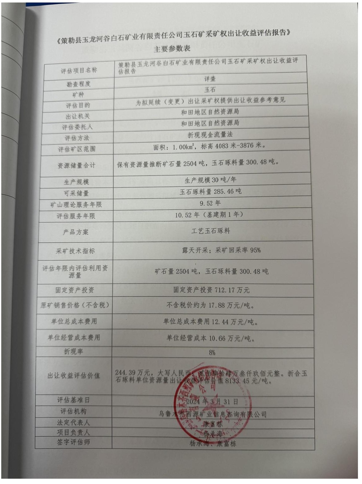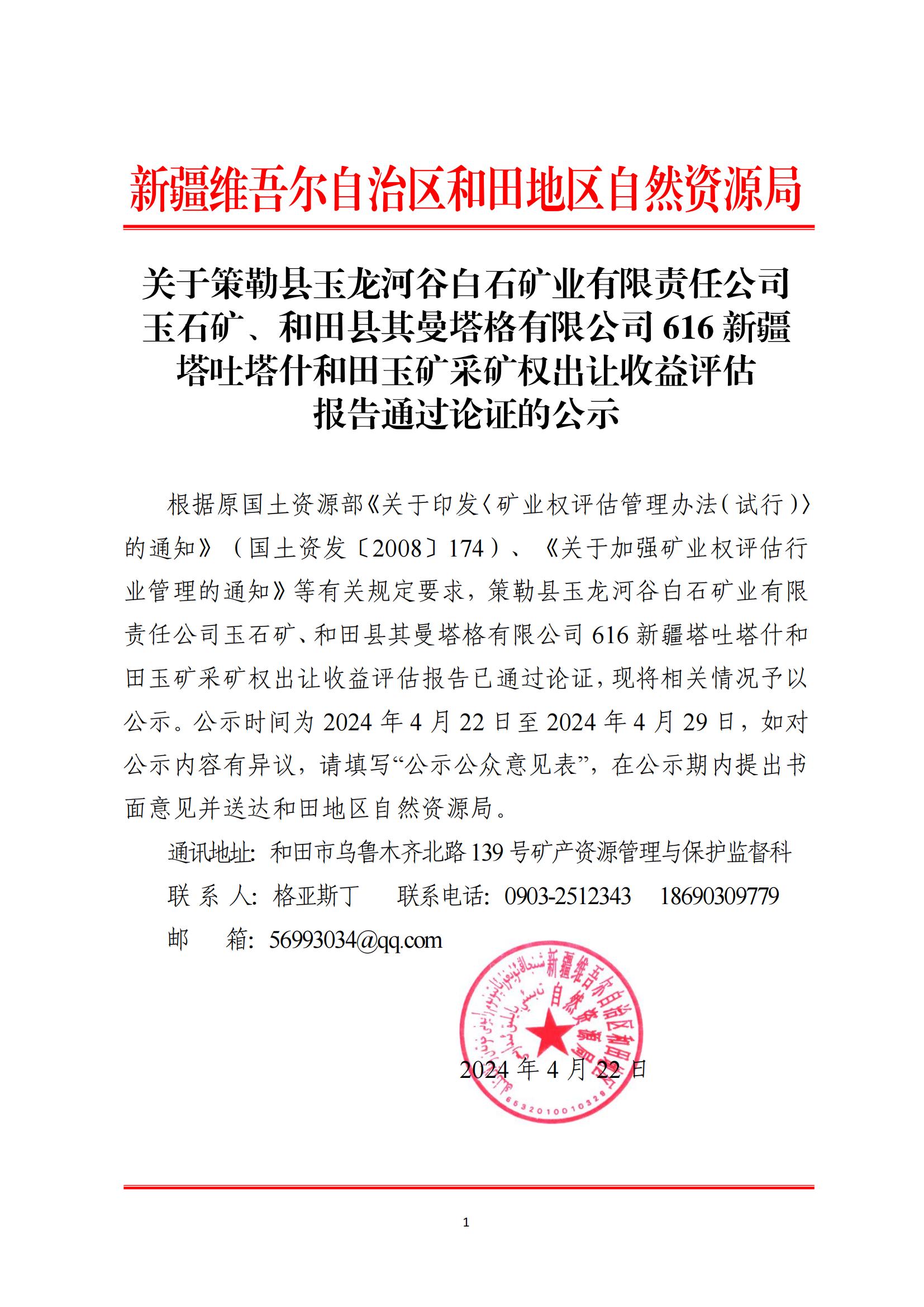 關(guān)于策勒縣玉龍河谷白石礦業(yè)有限責(zé)任公司玉石礦、和田縣其曼塔格有限公司616新疆塔吐塔什和田玉礦采礦權(quán)出讓收益評(píng)估報(bào)告通過(guò)論證的公示