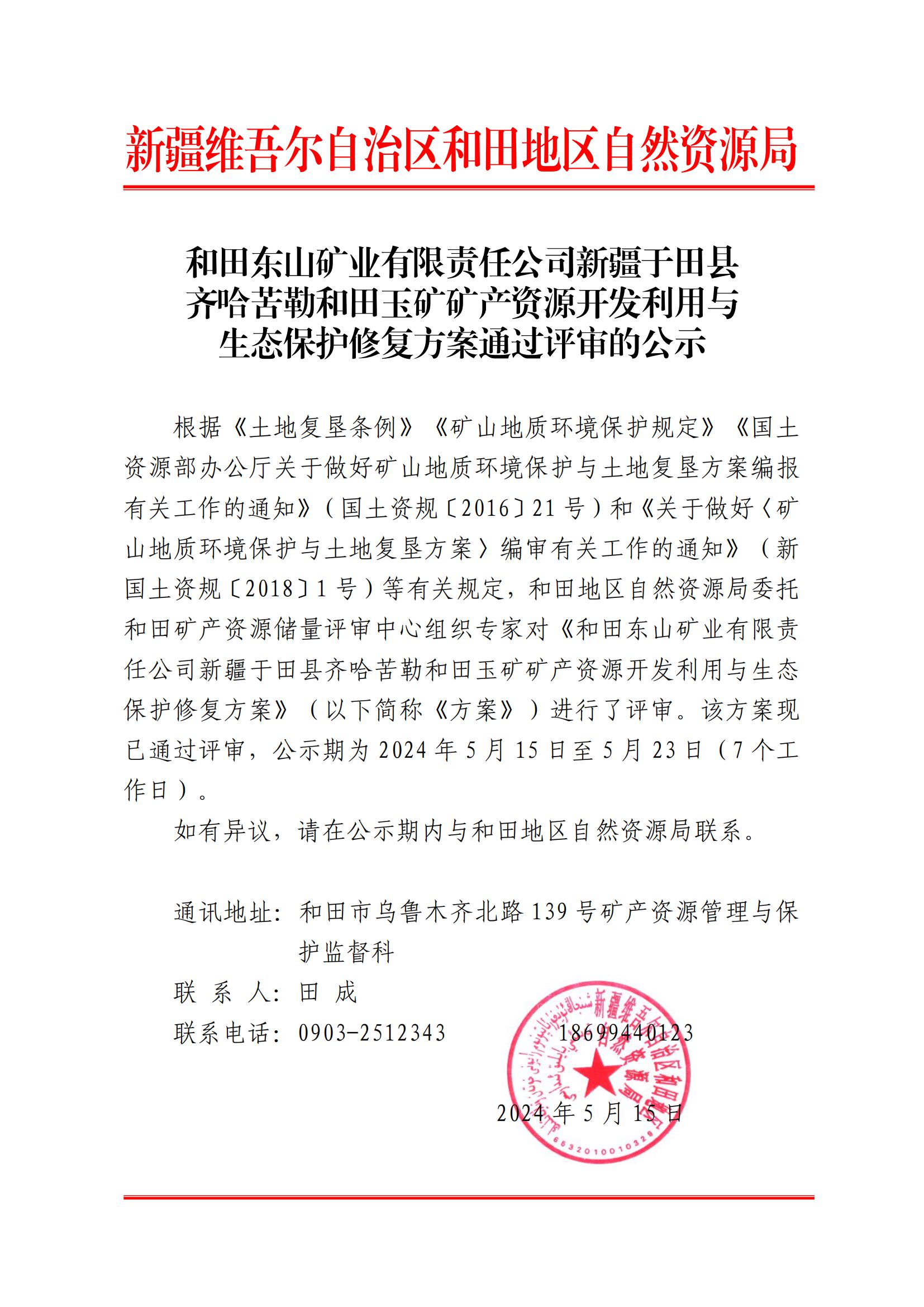 和田東山礦業(yè)有限責(zé)任公司新疆于田縣齊哈苦勒和田玉礦礦產(chǎn)資源開(kāi)發(fā)利用與生態(tài)保護(hù)修復(fù)方案通過(guò)評(píng)審的公示