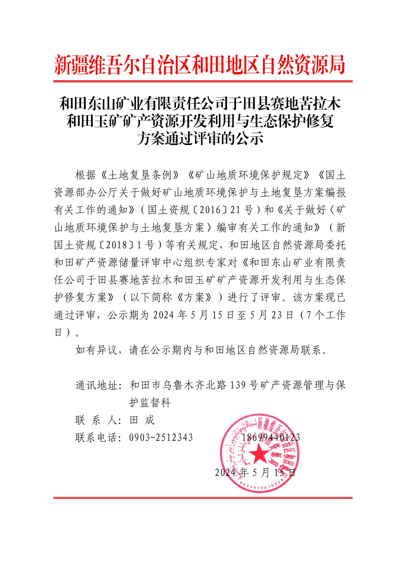 和田東山礦業(yè)有限責(zé)任公司于田縣賽地苦拉木和田玉礦礦產(chǎn)資源開(kāi)發(fā)利用與生態(tài)保護(hù)修復(fù)方案通過(guò)評(píng)審的公示