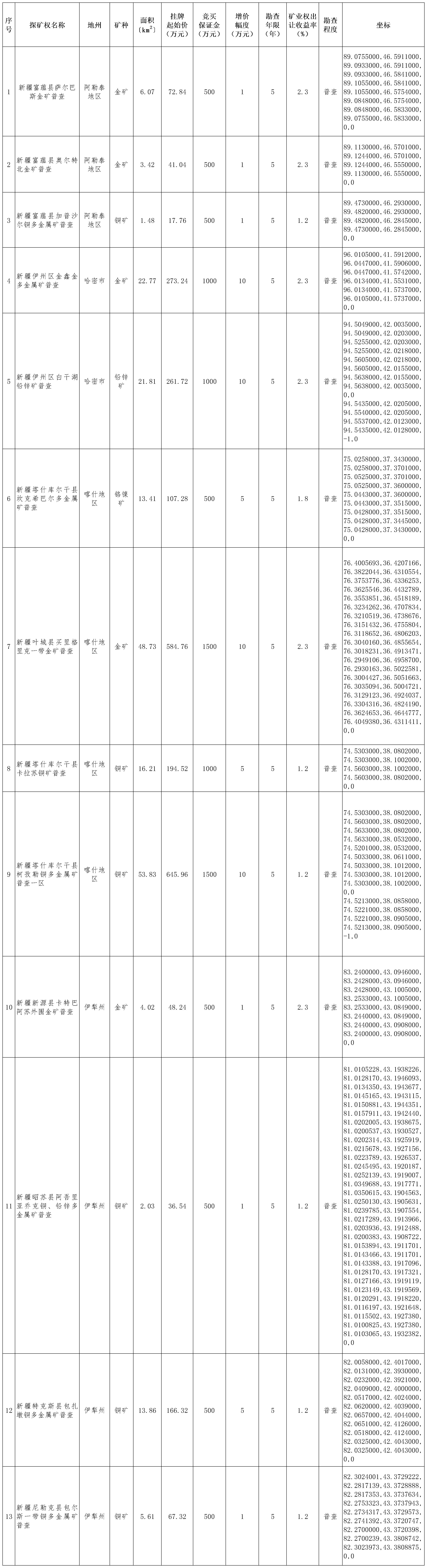 為促進礦產資源勘查開采,按照相關法律法規(guī)的規(guī)定,經自治區(qū)人民政府批準,受自治區(qū)自然資源廳委托,新疆維吾爾自治區(qū)政務服務和公共資源交易中心(以下簡稱交易中心)以掛牌方式出讓新疆富蘊縣薩爾巴斯金礦普查等13個探礦權?,F將有關事項公告如下: