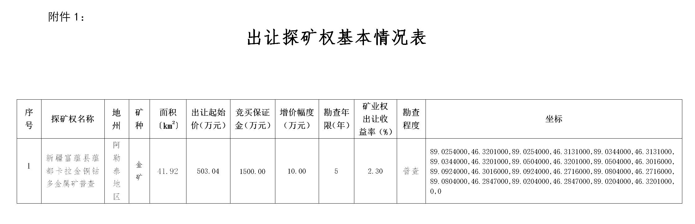 出讓探礦權(quán)名稱、面積、拐點坐標、掛牌起始價、增價幅度等基本情況(見附件1)。