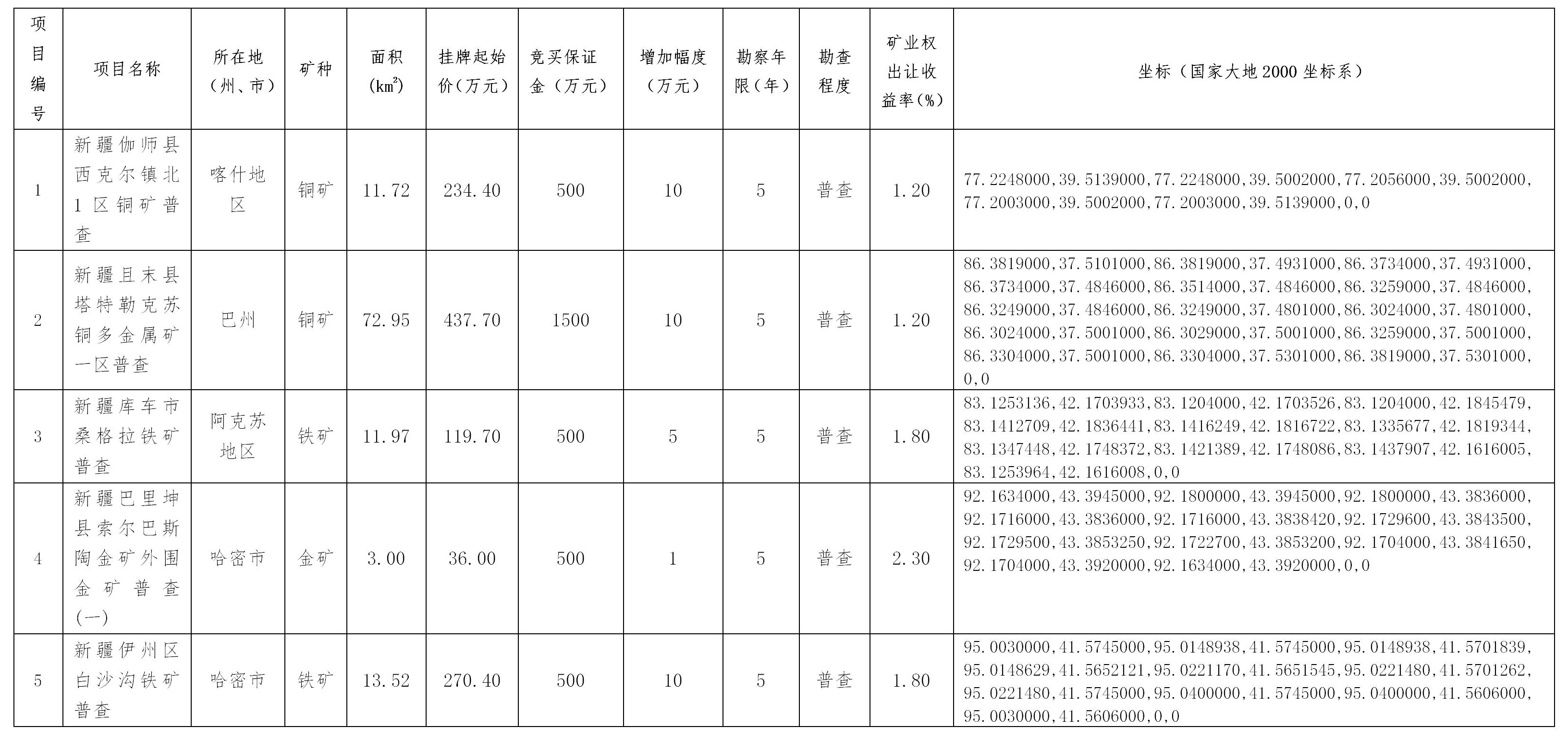 出讓探礦權名稱、面積、拐點坐標、掛牌起始價、礦業(yè)權出讓收益率、增價幅度等基本情況(見附件1)。