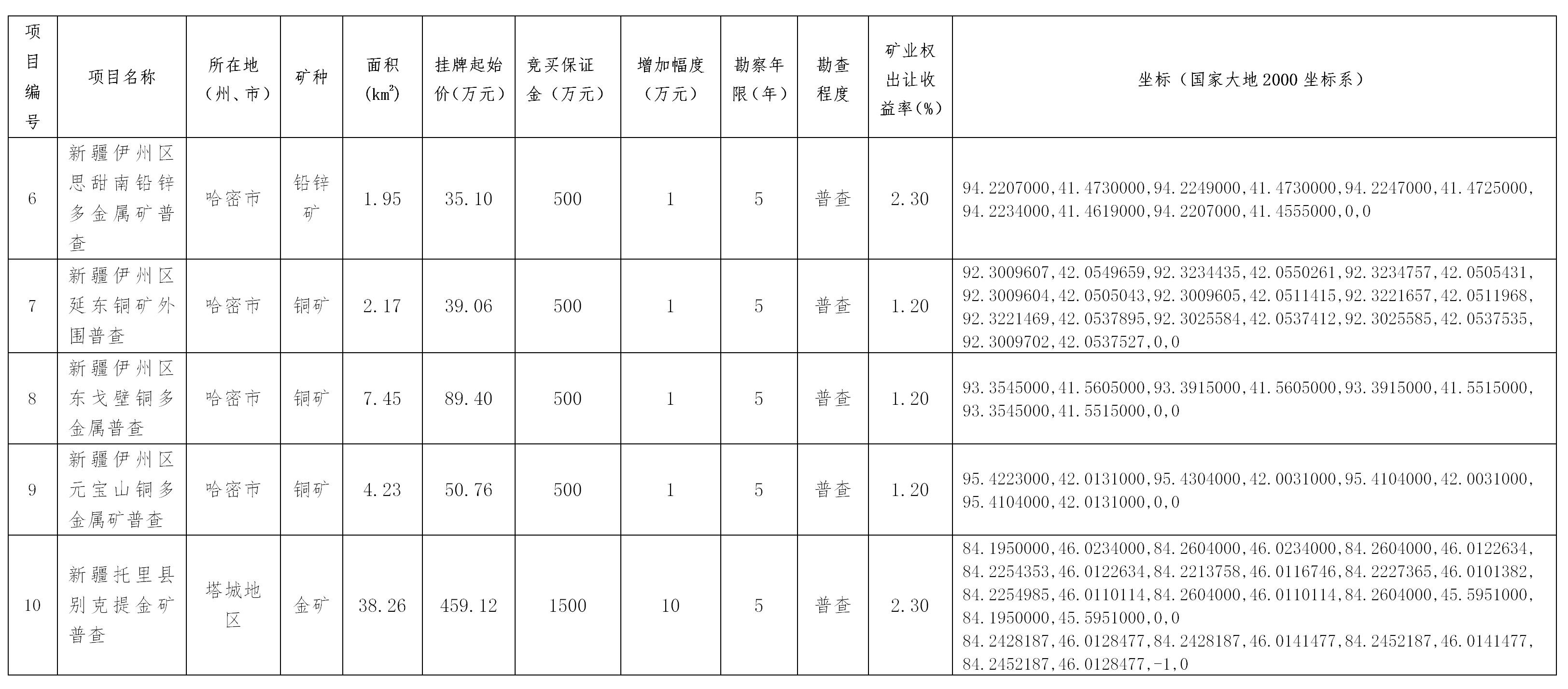 為促進礦產(chǎn)資源勘查開采,按照相關法律法規(guī)的規(guī)定,經(jīng)自治區(qū)人民政府批準,受自治區(qū)自然資源廳委托,新疆維吾爾自治區(qū)政務服務和公共資源交易中心(以下簡稱交易中心)以掛牌方式出讓新疆伽師縣西克爾鎮(zhèn)北1區(qū)銅礦普查等10個探礦權?,F(xiàn)將有關事項公告如下: