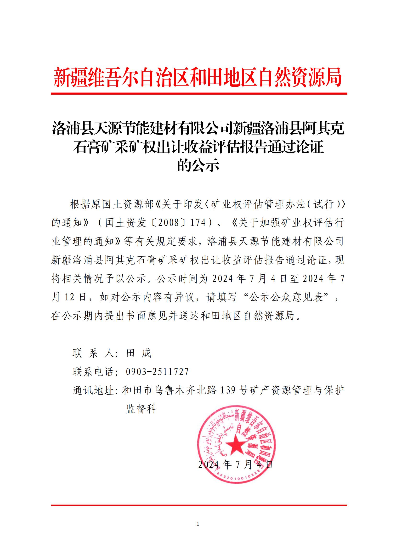 洛浦縣天源節(jié)能建材有限公司新疆洛浦縣阿其克石膏礦采礦權出讓收益評估報告通過論證的公示