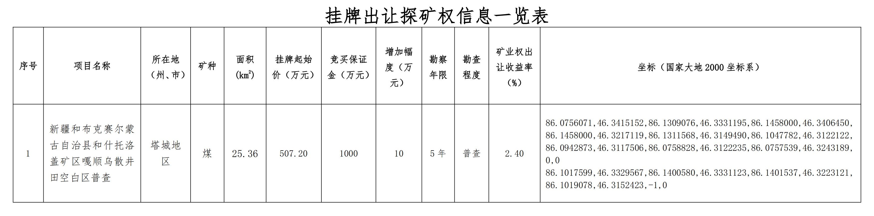 出讓探礦權名稱、面積、拐點坐標、掛牌起始價、礦業(yè)權出讓收益率、增價幅度等基本情況(見附件1)。