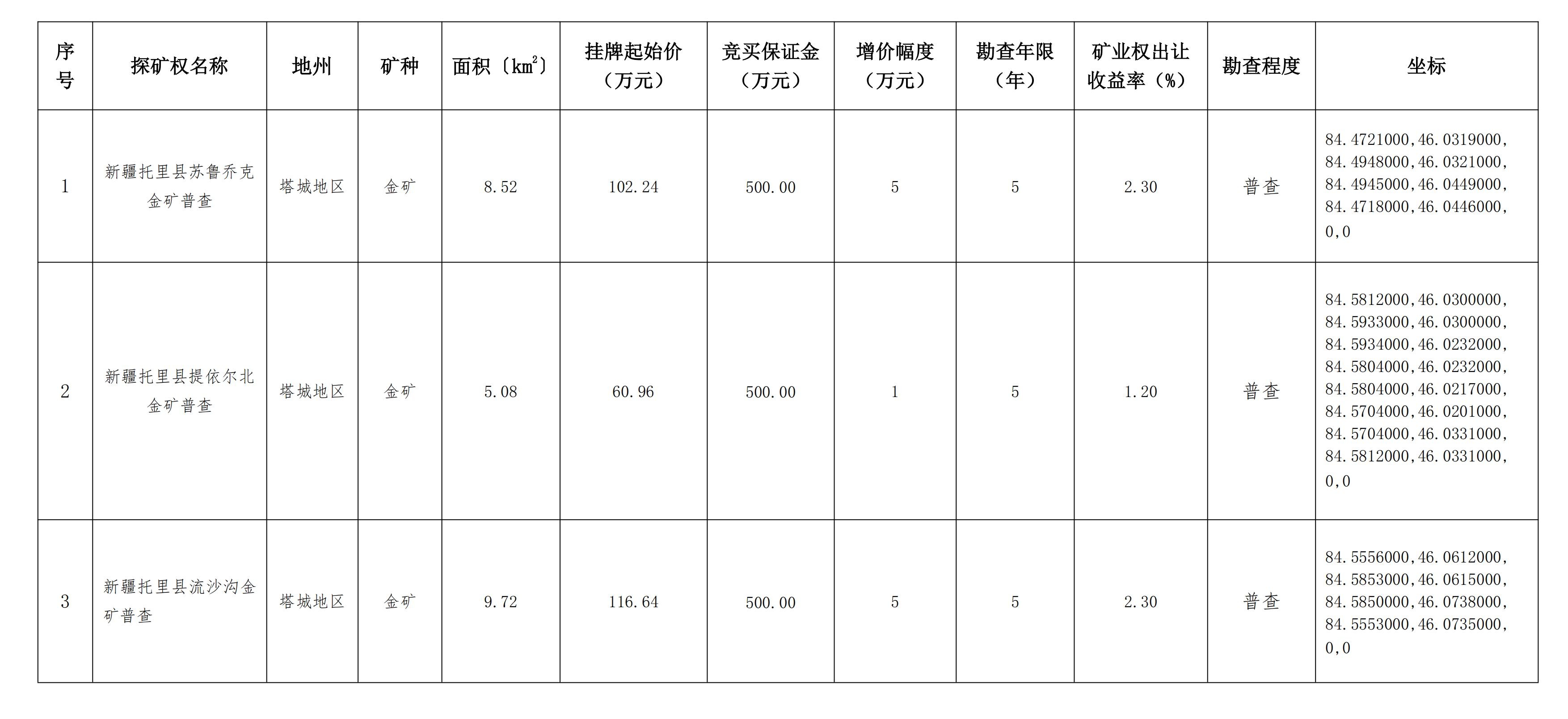 勘查礦種:金礦、掛牌起始價、礦業(yè)權(quán)出讓收益率、增價幅度等基本情況(見附件1)。