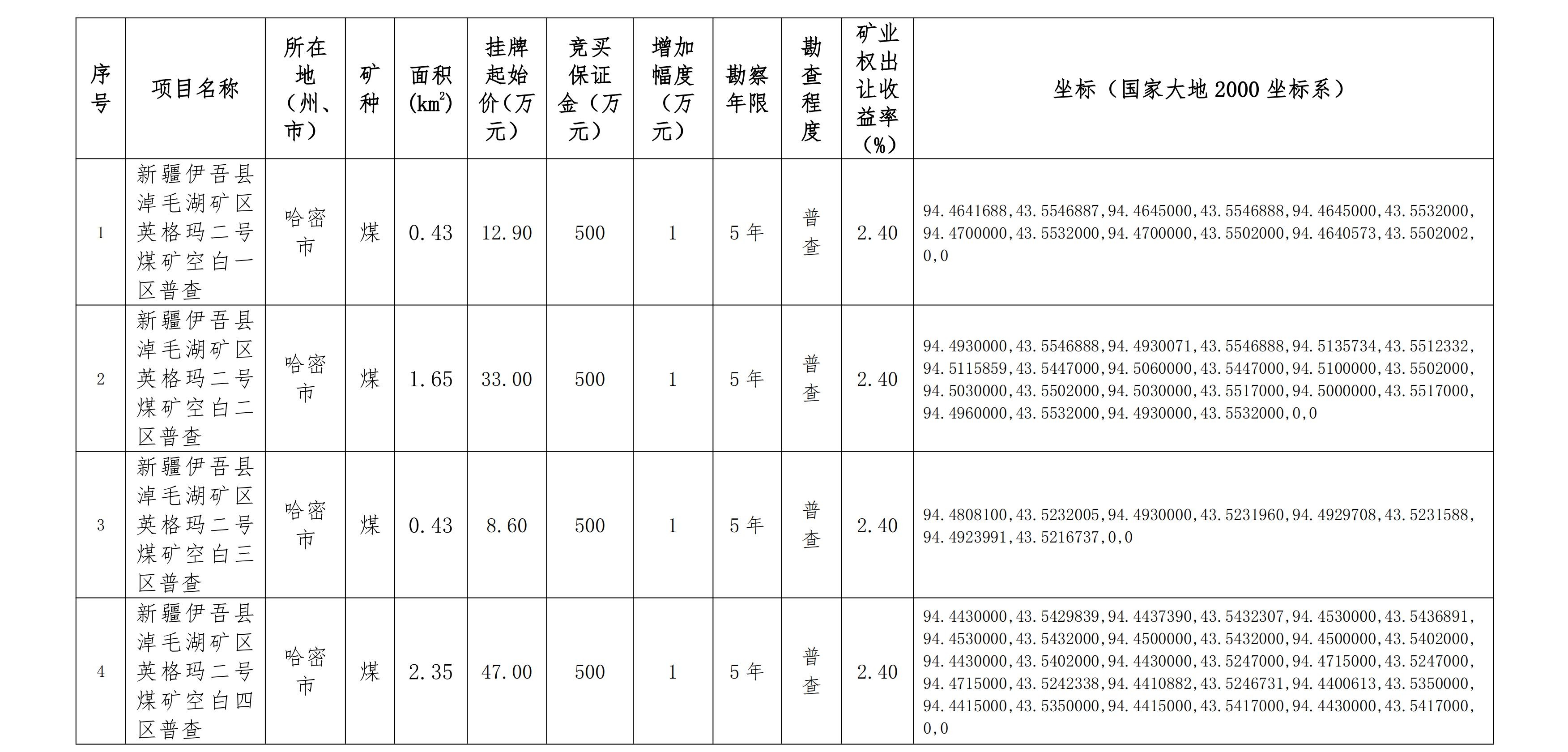 出讓探礦權(quán)名稱、面積、拐點(diǎn)坐標(biāo)、掛牌起始價(jià)、礦業(yè)權(quán)出讓收益率、增價(jià)幅度等基本情況(見(jiàn)附件1)。