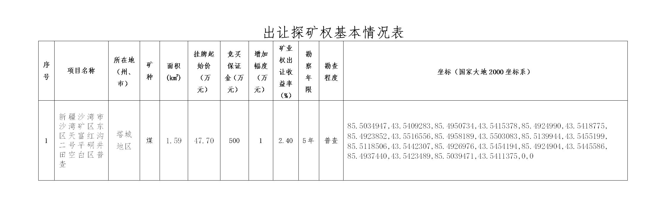 出讓探礦權名稱、面積、拐點坐標、掛牌起始價、礦業(yè)權出讓收益率、增價幅度等基本情況(見附件1)。