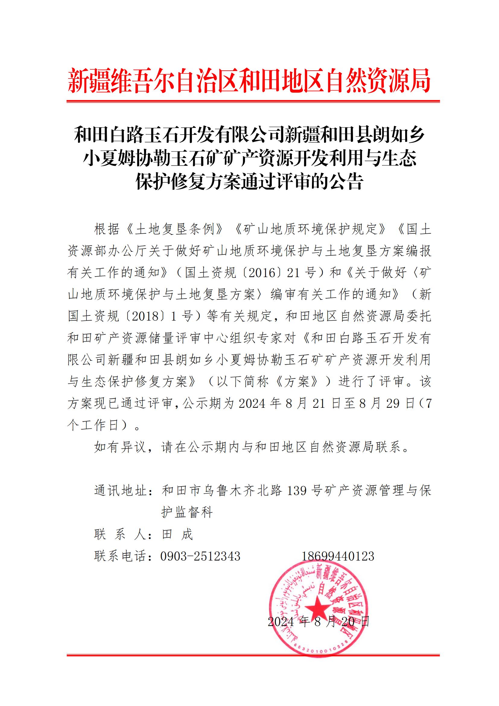 和田白路玉石開發(fā)有限公司新疆和田縣朗如鄉(xiāng)小夏姆協(xié)勒玉石礦礦產(chǎn)資源開發(fā)利用與生態(tài)保護(hù)修復(fù)方案通過(guò)評(píng)審的公告