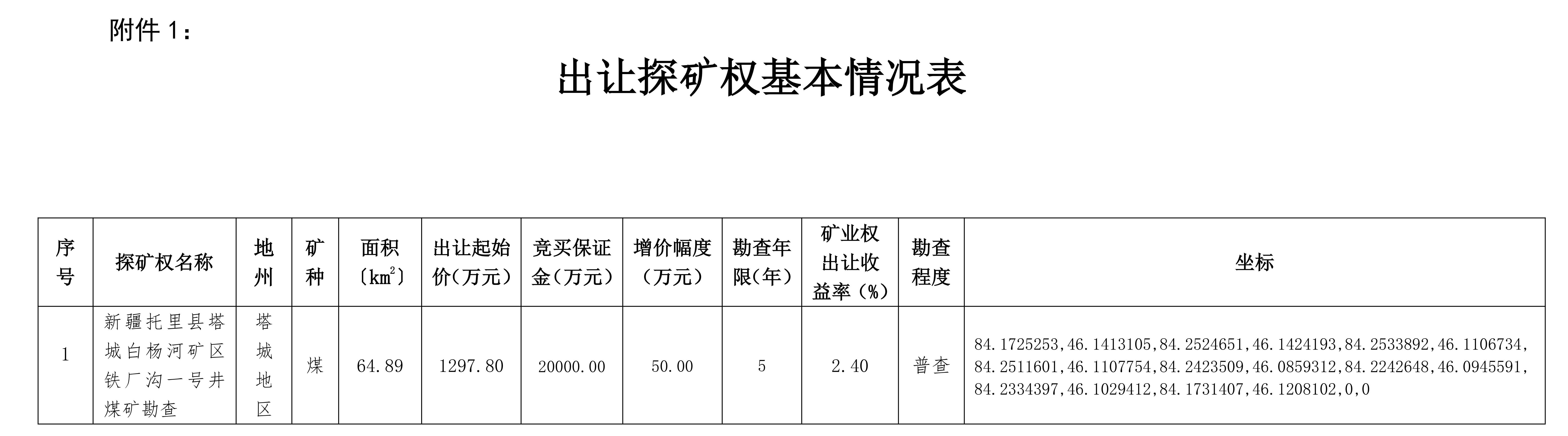 為促進(jìn)礦產(chǎn)資源勘查開(kāi)采,按照相關(guān)法律法規(guī)的規(guī)定,經(jīng)自治區(qū)人民政府批準(zhǔn),新疆維吾爾自治區(qū)政務(wù)服務(wù)和公共資源交易中心(以下簡(jiǎn)稱交易中心)受自治區(qū)自然資源廳委托以掛牌方式出讓新疆托里縣塔城白楊河礦區(qū)鐵廠溝一號(hào)井煤礦勘查探礦權(quán)?,F(xiàn)將有關(guān)事項(xiàng)公告如下: