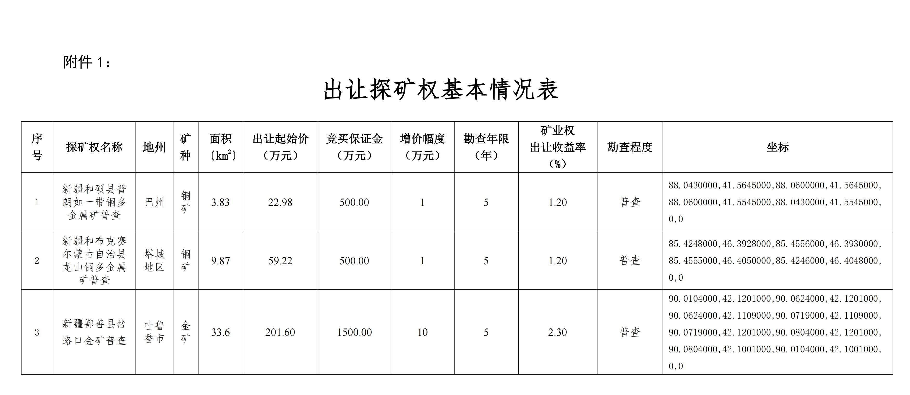 出讓探礦權(quán)名稱、面積、拐點(diǎn)坐標(biāo)、掛牌起始價、增價幅度等基本情況(見附件1)。