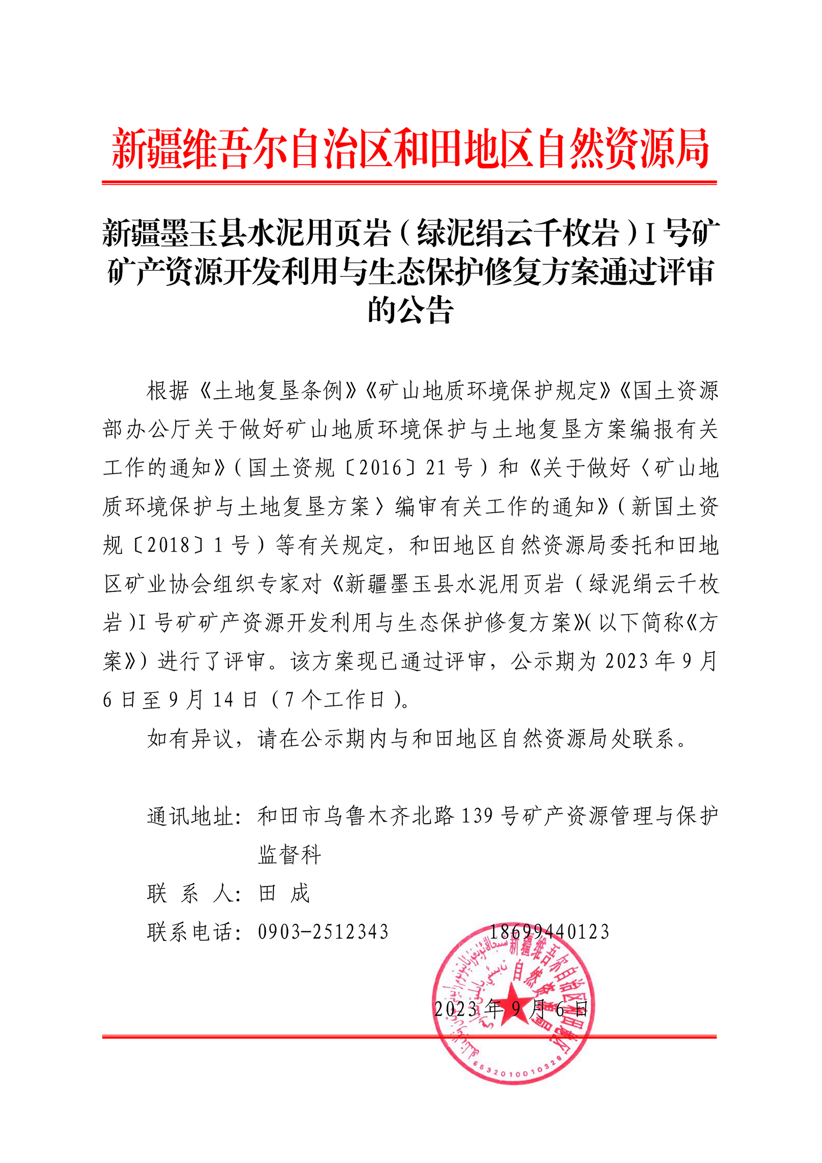 新疆墨玉縣水泥用頁(yè)巖(綠泥絹云千枚巖)I號(hào)礦礦產(chǎn)資源開(kāi)發(fā)利用與生態(tài)保護(hù)修復(fù)方案通過(guò)評(píng)審的公告