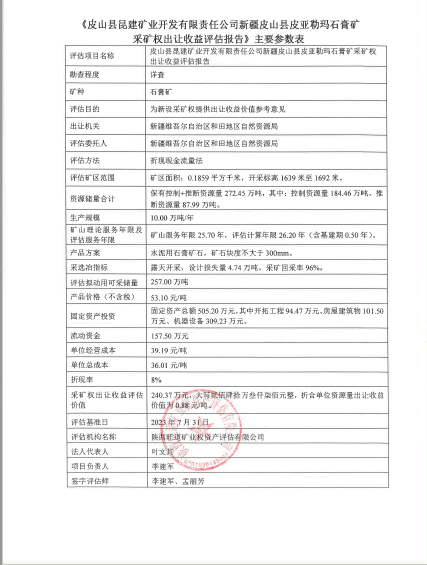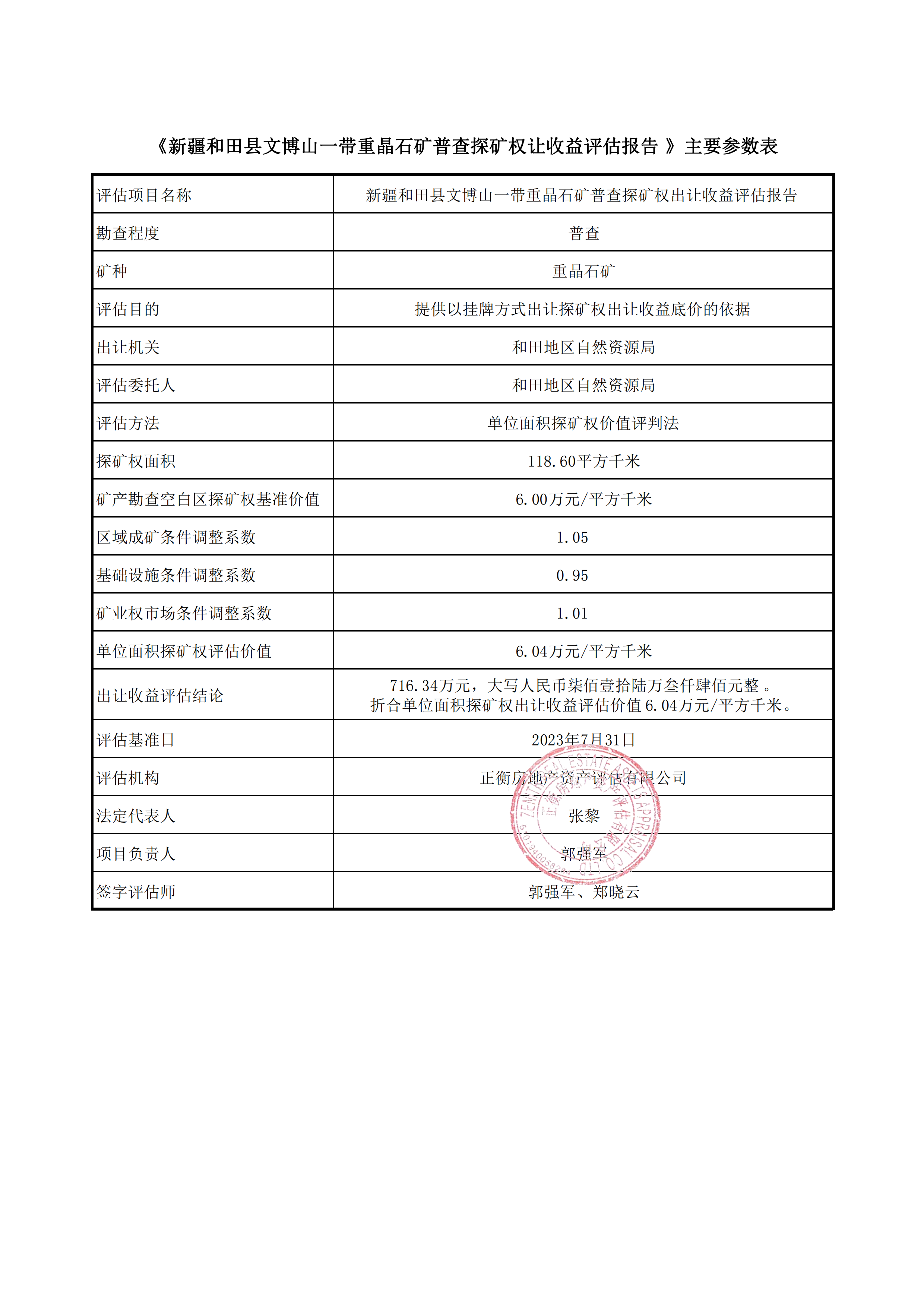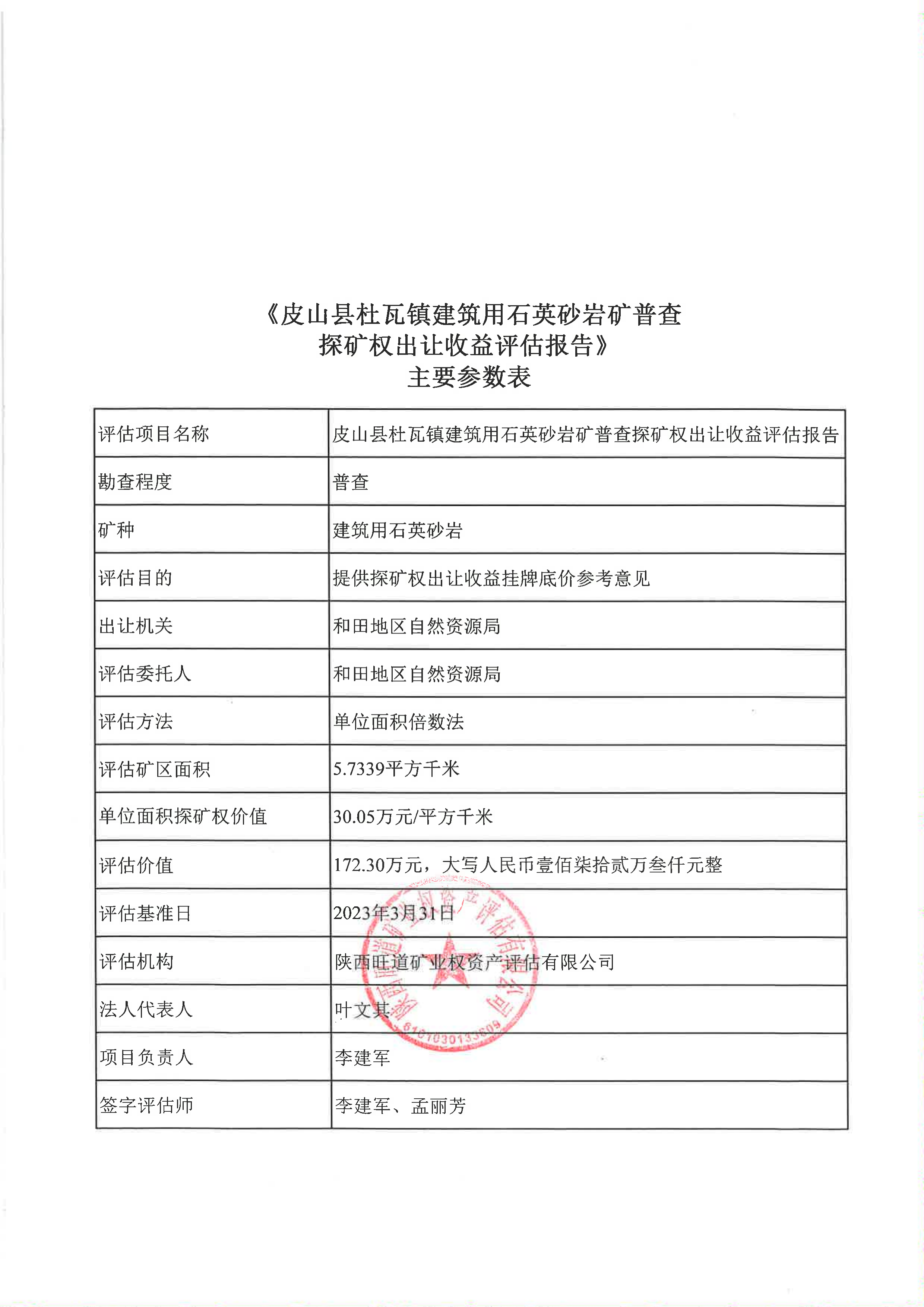 根據(jù)原國土資源部《關(guān)于印發(fā)〈礦業(yè)權(quán)評估管理辦法(試行)〉的通知》(國土資發(fā)〔2008〕174)、《關(guān)于加強(qiáng)礦業(yè)權(quán)評估行業(yè)管理的通知》等有關(guān)規(guī)定要求,新疆皮山縣伯峰石英礦普查探礦權(quán)出讓收益、新疆和田縣文博山一帶重晶石礦普查探礦權(quán)出讓收益、皮山縣皮亞勒瑪石膏礦普查采礦權(quán)出讓收益、皮山縣杜瓦鎮(zhèn)建筑用石英砂巖礦普查、新疆洛浦縣1號砂巖礦普查評估報告通過論證,現(xiàn)將相關(guān)情況予以公示。公示時間為2023年9月10日至2023年9月17日,如對公示內(nèi)容有異議,在公示期內(nèi)提出書面意見并送達(dá)和田地區(qū)自然資源局。