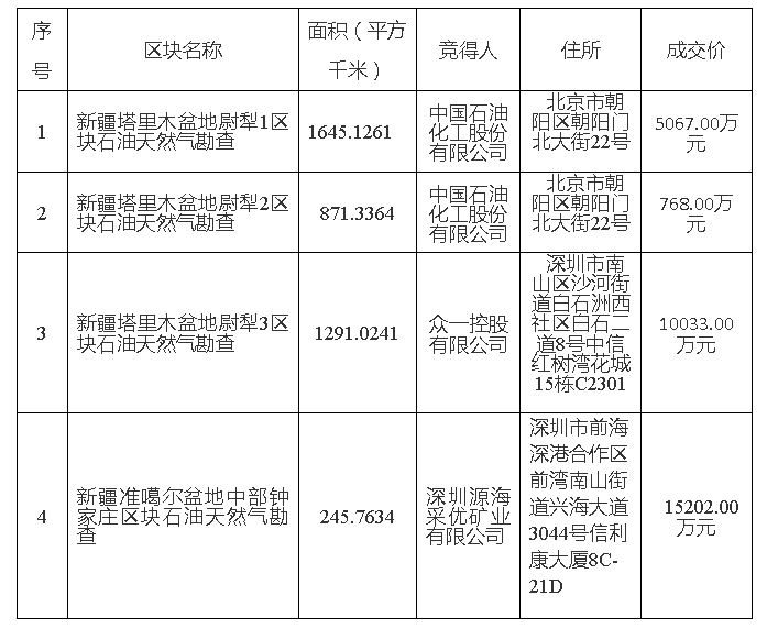 自然資源部組織新疆維吾爾自治區(qū)自然資源廳實(shí)施2024年新疆塔里木盆地尉犁1等4個(gè)石油天然氣探礦權(quán)掛牌出讓,由新疆維吾爾自治區(qū)政務(wù)服務(wù)和公共資源交易中心具體承辦?,F(xiàn)將出讓結(jié)果公示如下: