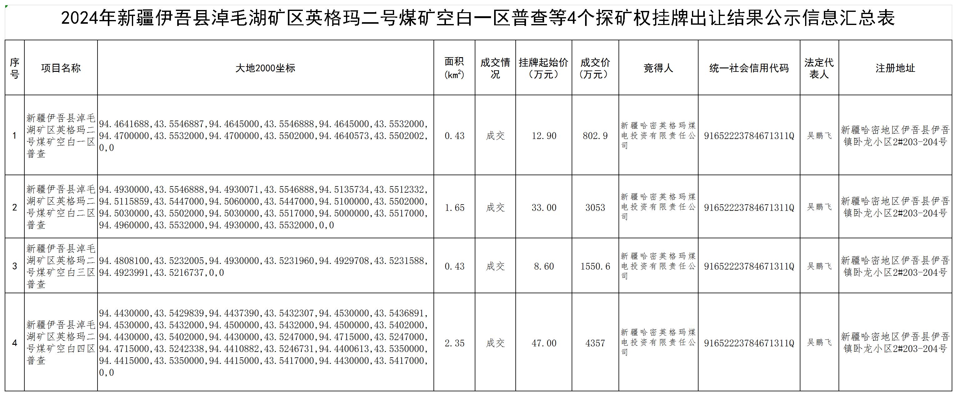 附件:2024年新疆新疆伊吾縣淖毛湖礦區(qū)英格瑪二號(hào)煤礦空白一區(qū)普查等4個(gè)探礦權(quán)掛牌出讓結(jié)果公示信息匯總表