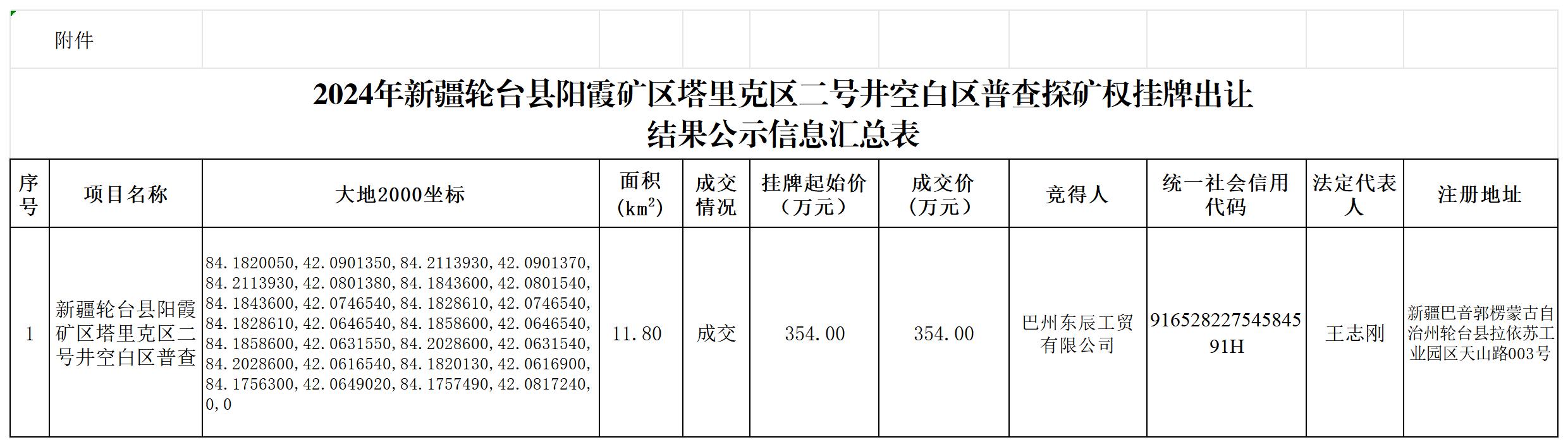 附表:2024年新疆輪臺(tái)縣陽霞礦區(qū)塔里克區(qū)二號(hào)井空白區(qū)普查探礦權(quán)掛牌出讓結(jié)果公示信息匯總表