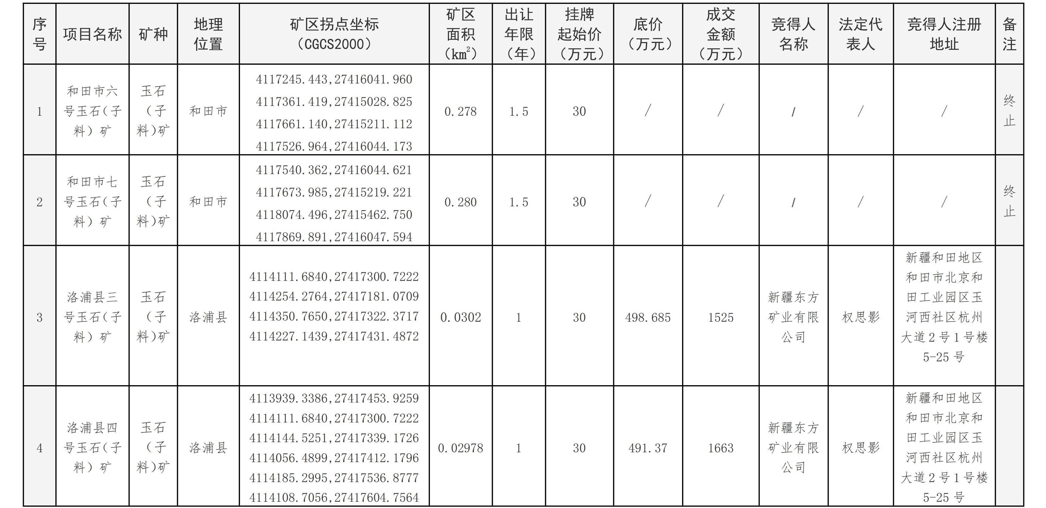 根據(jù)《礦業(yè)權(quán)出讓交易規(guī)則》等有關(guān)規(guī)定,按照《和田地區(qū)采礦權(quán)出讓公告》(和礦采告字〔2024〕7號(hào))程序,現(xiàn)將網(wǎng)上掛牌方式出讓成交結(jié)果公示如下:
