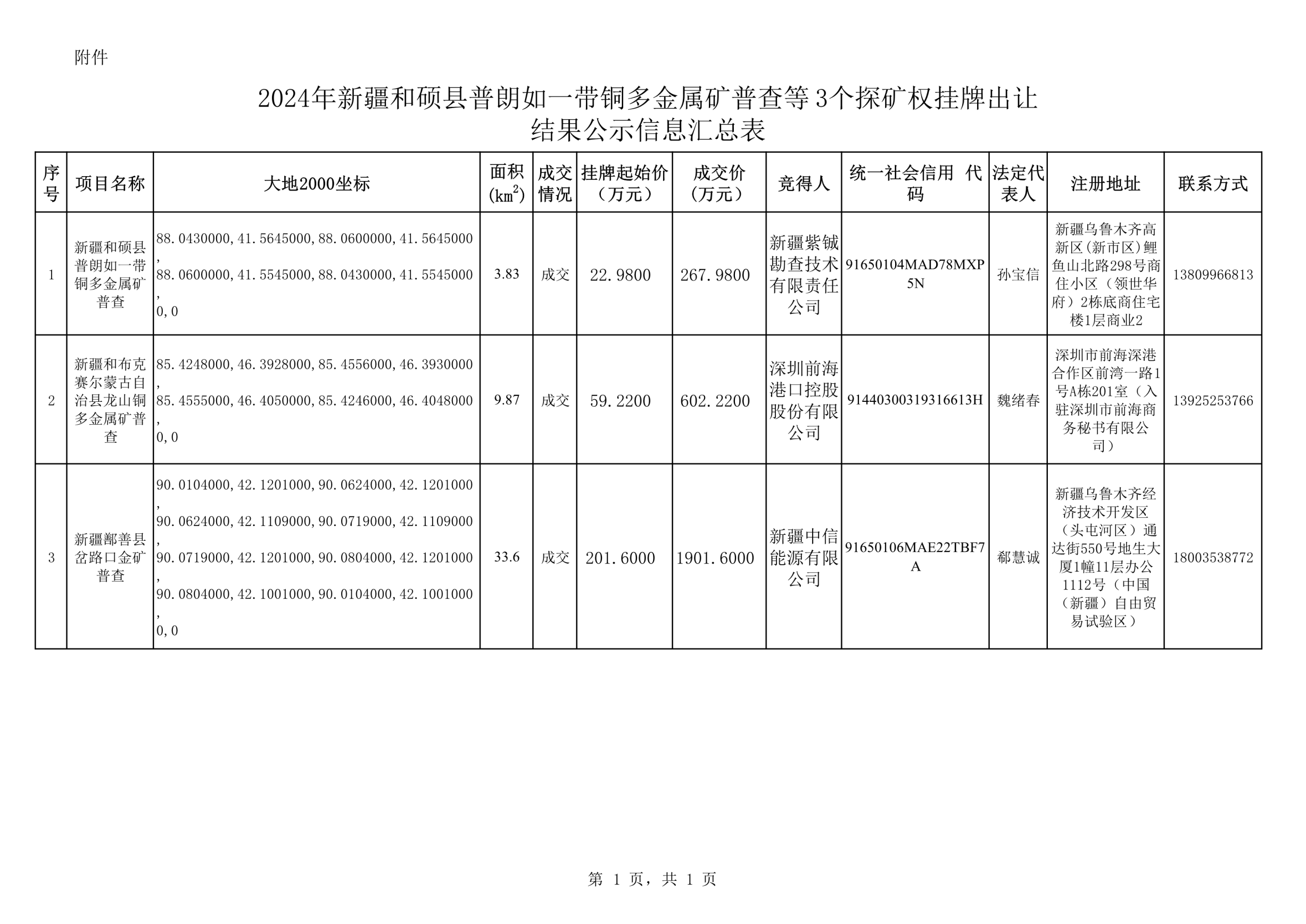 附表:新疆和碩縣普朗如一帶銅多金屬礦普查等3個探礦權掛牌出讓結果公示信息匯總表