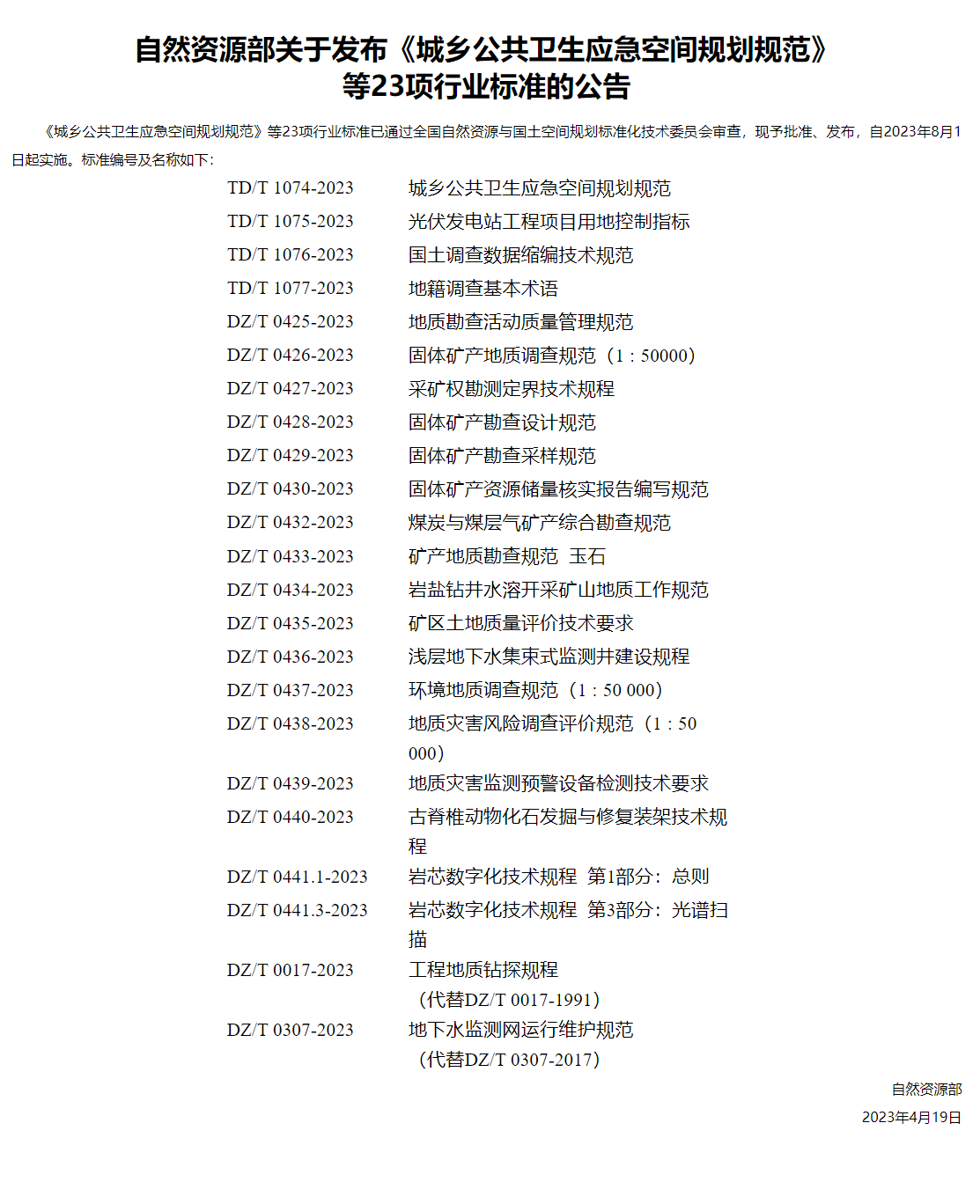 根據(jù)自然資源部發(fā)布的2023年第19號公告,由中國地質(zhì)調(diào)查局水文地質(zhì)環(huán)境地質(zhì)調(diào)查中心修訂的地質(zhì)礦產(chǎn)行業(yè)標準《工程地質(zhì)鉆探規(guī)程(DZ/T 0017-2023)》近日獲批發(fā)布,并將于2023年8月1日起實施。