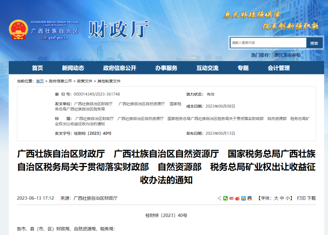 6月30日,廣西壯族自治區(qū)財政廳聯(lián)合自然資源廳、稅務局印發(fā)了《關于貫徹落實財政部 自然資源部 稅務總局礦業(yè)權出讓收益征收辦法的通知》?!锻ㄖ诽岢?,在新的礦業(yè)權出讓收益征收管理辦法印發(fā)實施前的過渡期內,對相關政策的執(zhí)行進行明確。