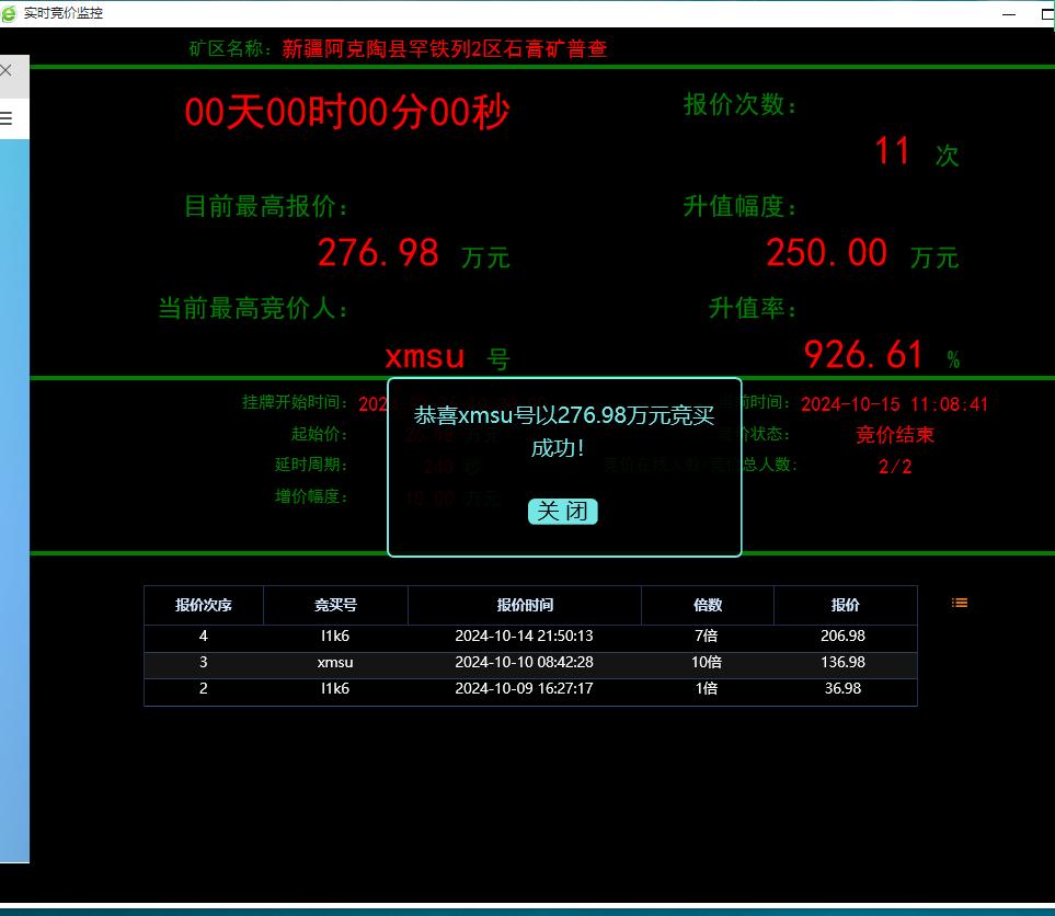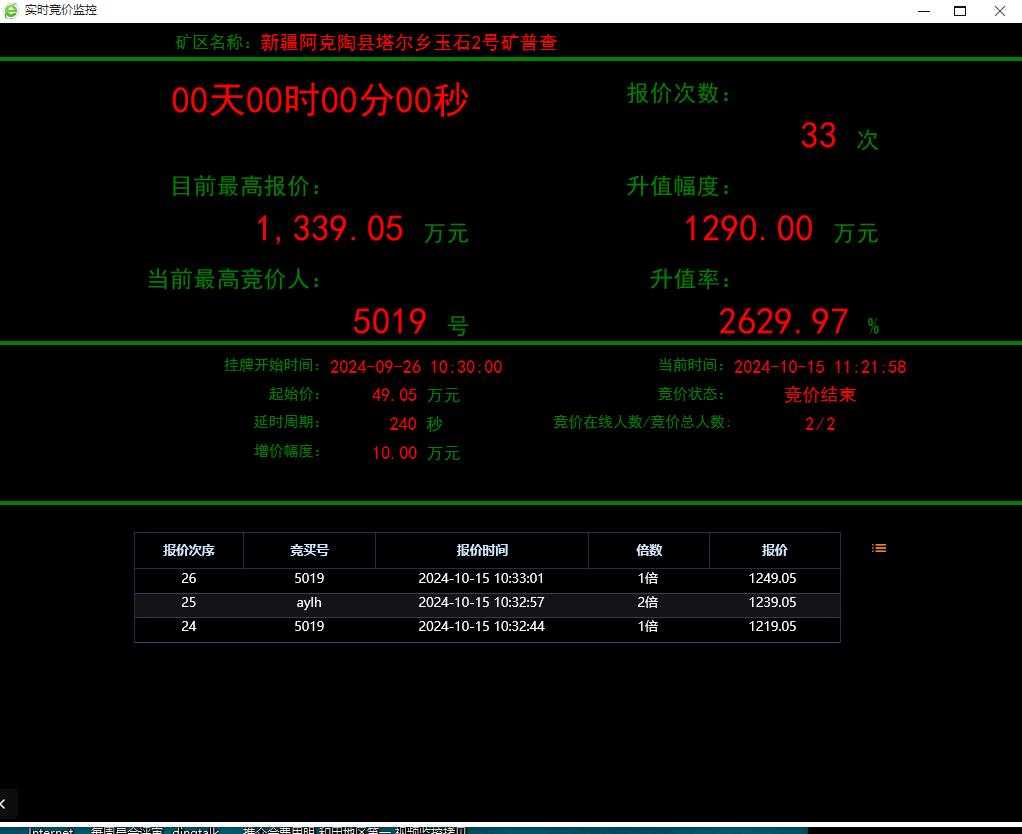 克州今年第二批探礦權于2024年10月15日在新疆自治區(qū)公共資源交易網(wǎng)通過全流程線上方式成功出讓,其中玉石礦溢價率達到2629.97%??酥葑匀毁Y源局及阿克陶縣自然資源局相關領導通過視頻會議參加本次掛牌會。