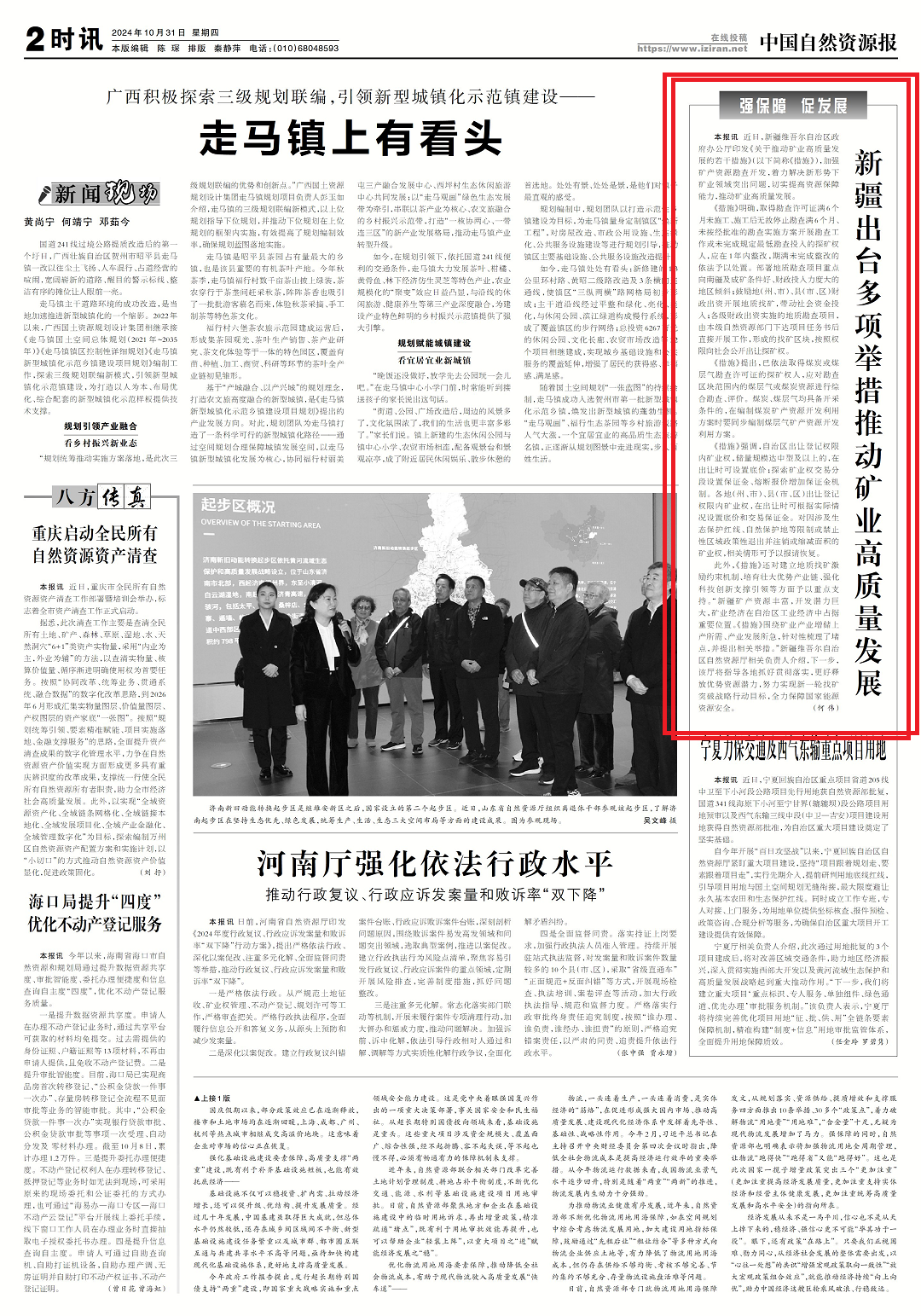 據(jù)中國自然資源報(bào)訊 近日,新疆維吾爾自治區(qū)政府辦公廳印發(fā)《關(guān)于推動礦業(yè)高質(zhì)量發(fā)展的若干措施》(以下簡稱《措施》),加強(qiáng)礦產(chǎn)資源勘查開發(fā),著力解決新形勢下礦業(yè)領(lǐng)域突出問題,切實(shí)提高資源保障能力,推動礦業(yè)高質(zhì)量發(fā)展。
