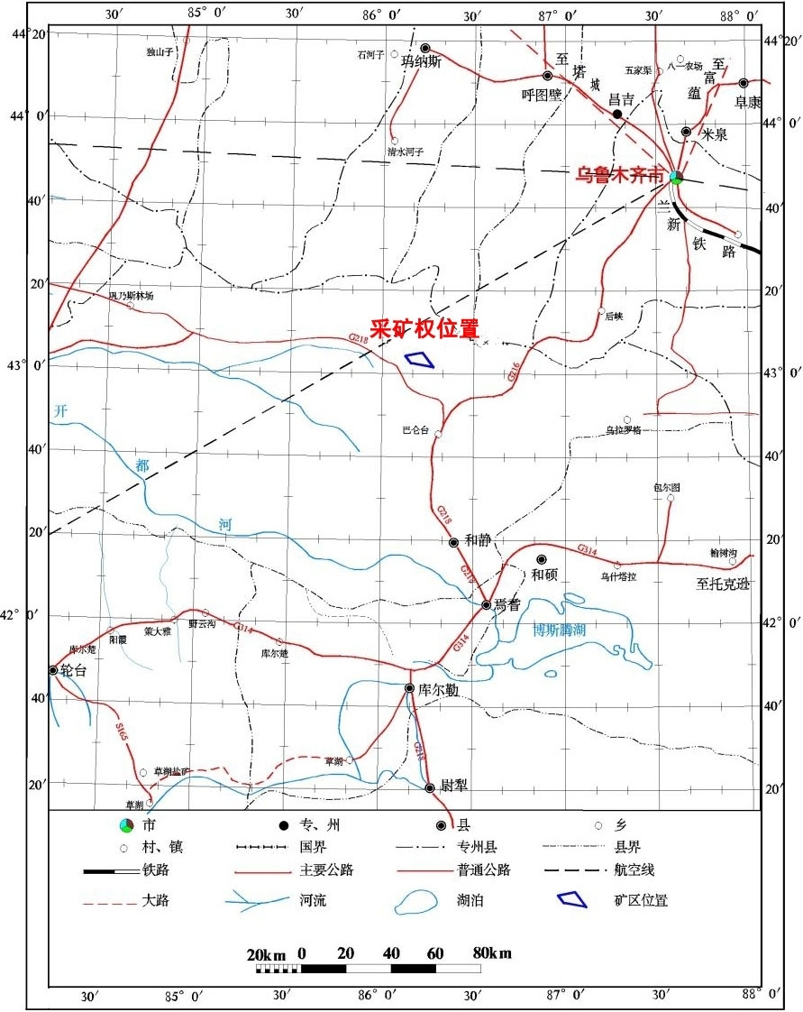 礦區(qū)西南側(cè)為218國(guó)道,正在建設(shè)的那巴高速?gòu)牡V區(qū)西側(cè)穿過。礦區(qū)距國(guó)道有牧道可供大型貨車通行。從和靜縣城向西北方向沿G218國(guó)道行駛71km后,沿包勒溝繼續(xù)向北行駛3km后到達(dá)礦區(qū)(礦區(qū)位于公路北側(cè)2km處),總里程74km。交通條件較便利。