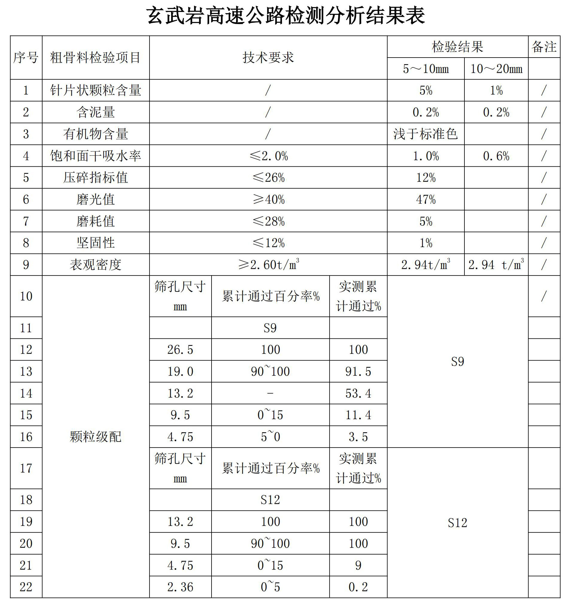 區(qū)內(nèi)礦石經(jīng)檢測(cè)化驗(yàn),所有檢測(cè)項(xiàng)目均符合高速公路用料規(guī)范指標(biāo)。