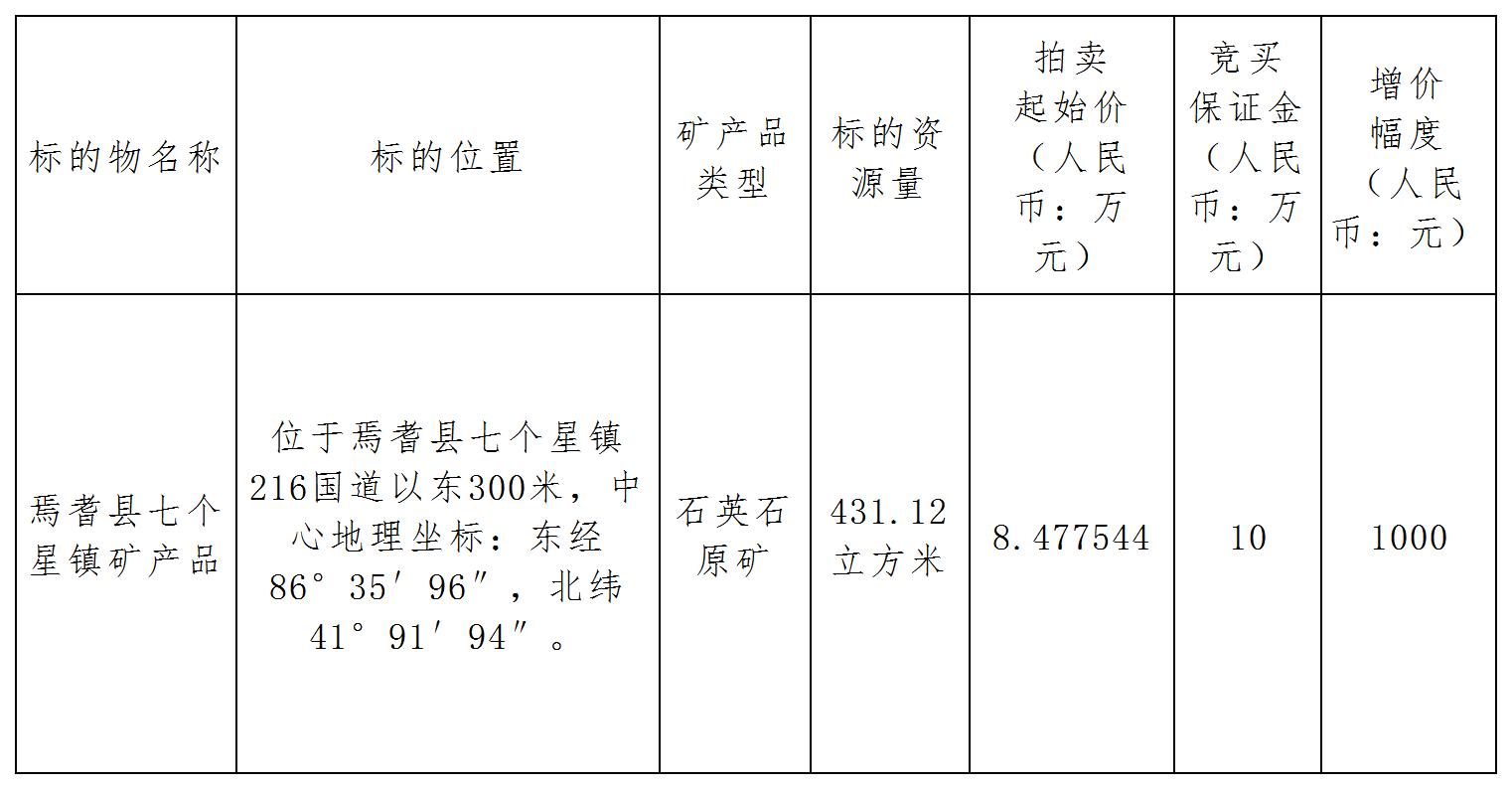 經(jīng)批準(zhǔn),新疆公信拍賣(mài)有限公司受焉耆縣天河國(guó)有資產(chǎn)經(jīng)營(yíng)有限責(zé)任公司委托,對(duì)焉耆縣七個(gè)星鎮(zhèn)礦產(chǎn)品進(jìn)行公開(kāi)拍賣(mài),現(xiàn)將有關(guān)事項(xiàng)公告如下: