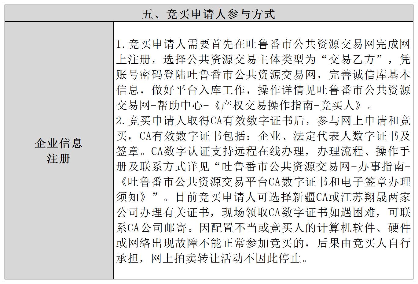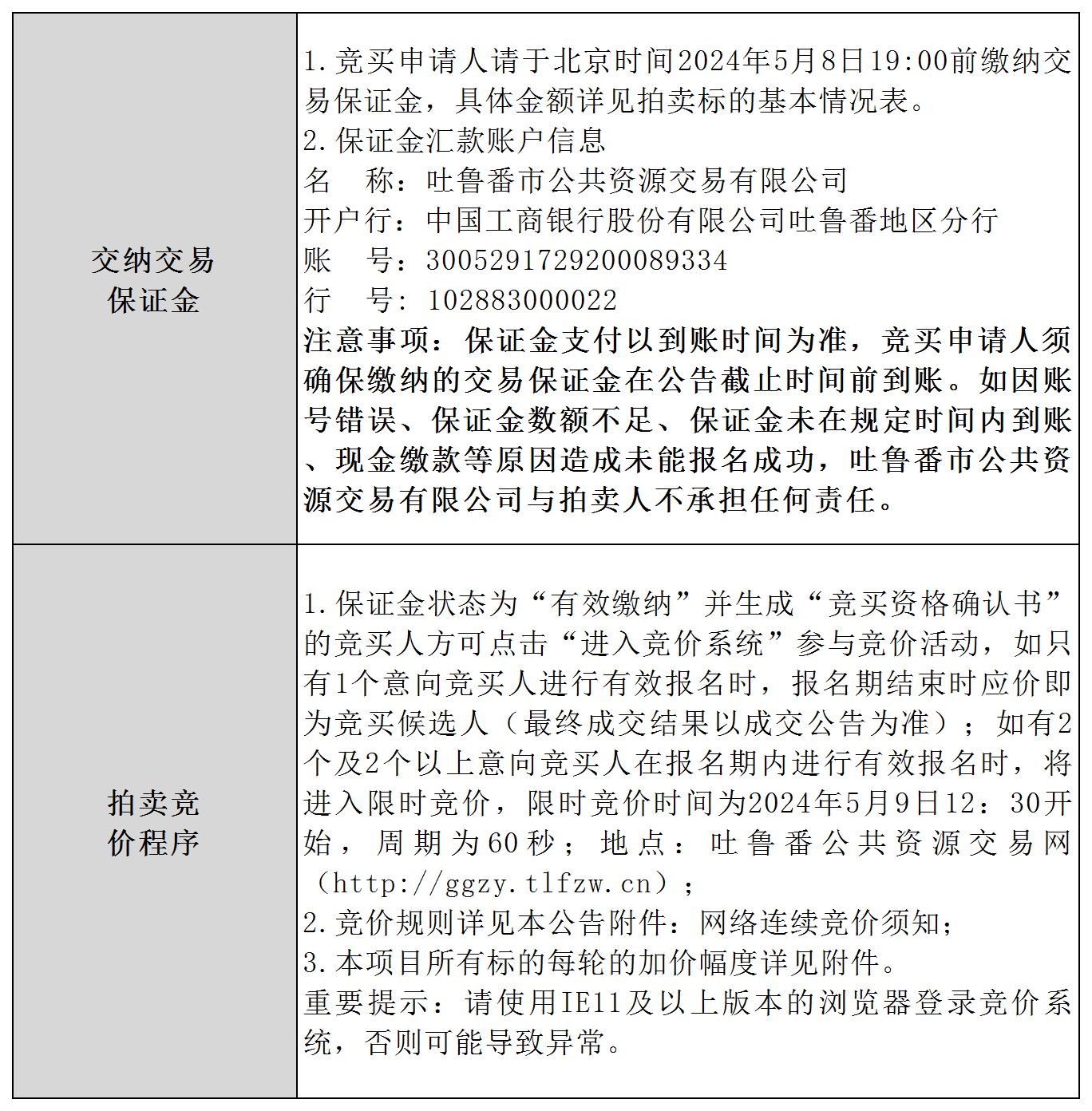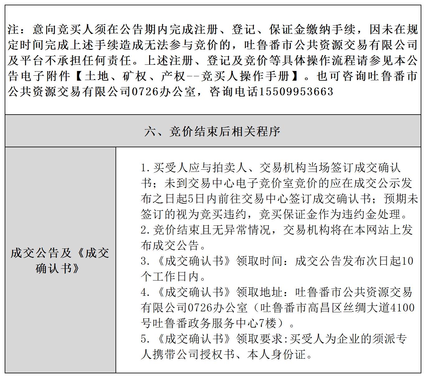 3.意向方進(jìn)入競價系統(tǒng)進(jìn)行應(yīng)(報)價,即視為接受吐魯番市公共資源交易有限公司就本項目發(fā)布的公告(包括附件及變更公告)、【土地、礦權(quán)、產(chǎn)權(quán)--競買人操作手冊】及其他形式通知的全部內(nèi)容并無異議。