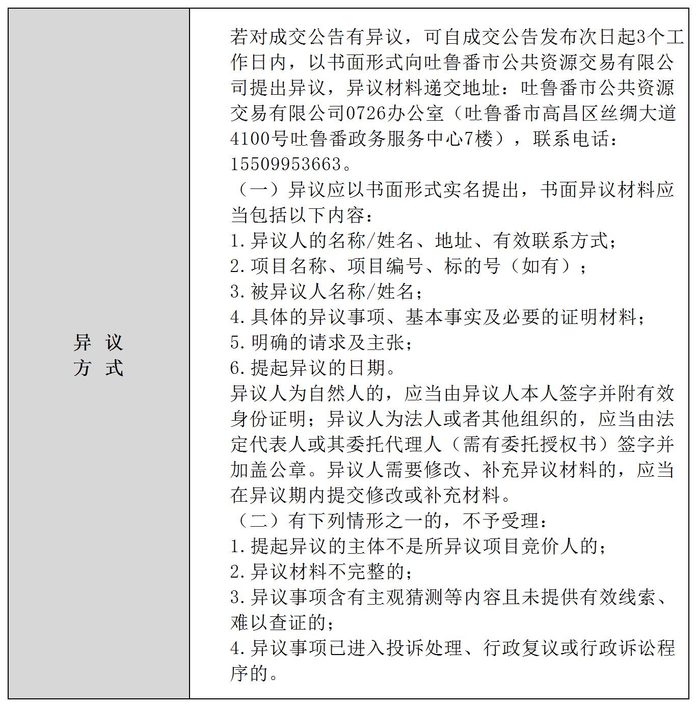 如因系統(tǒng)故障導(dǎo)致吐魯番市公共資源交易有限公司未能及時暫停應(yīng)(報)價而出現(xiàn)應(yīng)(報)價結(jié)束的,或因系統(tǒng)故障導(dǎo)致項目信息需要重建的,吐魯番市公共資源交易有限公司將中止應(yīng)(報)價活動。中止應(yīng)(報)價活動時系統(tǒng)顯示的最高應(yīng)(報)價僅為當(dāng)前最高報價,非成交價格;最高應(yīng)(報)價者僅為當(dāng)前最高應(yīng)(報)價的意向方。