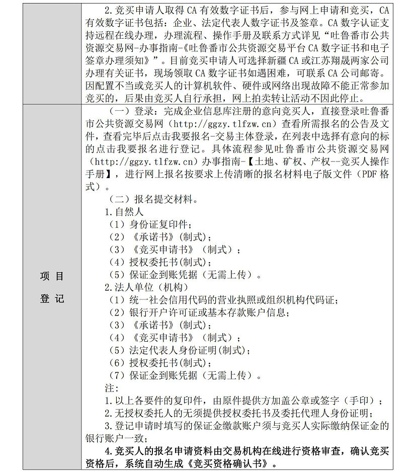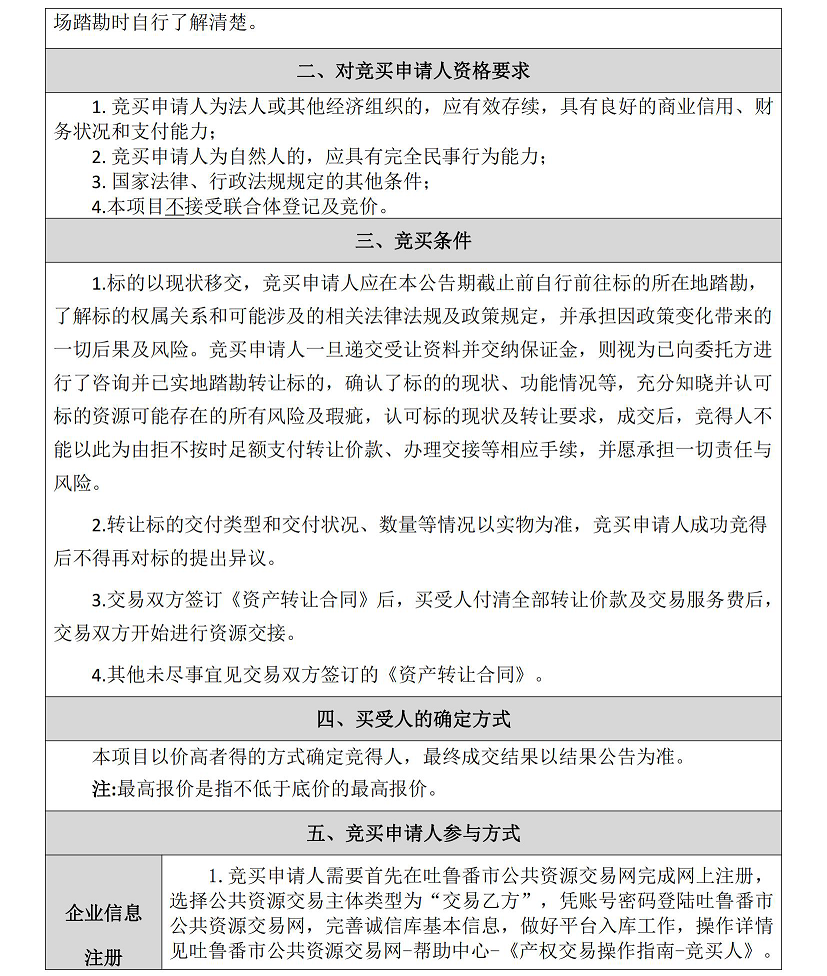 3.意向方進(jìn)入競(jìng)價(jià)系統(tǒng)進(jìn)行應(yīng)(報(bào))價(jià),即視為接受吐魯番市公共資源交易有限公司就本項(xiàng)目發(fā)布的公告(包括附件及變更公告)、【土地、礦權(quán)、產(chǎn)權(quán)--競(jìng)買人操作手冊(cè)】及其他形式通知的全部?jī)?nèi)容并無(wú)異議。
