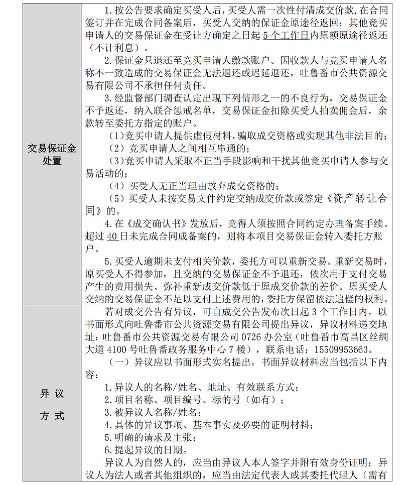 如因系統(tǒng)故障導(dǎo)致吐魯番市公共資源交易有限公司未能及時(shí)暫停應(yīng)(報(bào))價(jià)而出現(xiàn)應(yīng)(報(bào))價(jià)結(jié)束的,或因系統(tǒng)故障導(dǎo)致項(xiàng)目信息需要重建的,吐魯番市公共資源交易有限公司將中止應(yīng)(報(bào))價(jià)活動(dòng)。中止應(yīng)(報(bào))價(jià)活動(dòng)時(shí)系統(tǒng)顯示的最高應(yīng)(報(bào))價(jià)僅為當(dāng)前最高報(bào)價(jià),非成交價(jià)格;最高應(yīng)(報(bào))價(jià)者僅為當(dāng)前最高應(yīng)(報(bào))價(jià)的意向方。