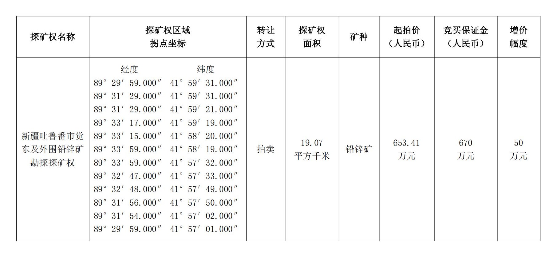 根據(jù)《中華人民共和國(guó)民法典》《中華人民共和國(guó)礦產(chǎn)資源法》《中華人民共和國(guó)拍賣(mài)法》《中華人民共和國(guó)礦產(chǎn)資源法》《礦產(chǎn)資源勘查區(qū)塊登記管理辦法》《探礦權(quán)采礦權(quán)轉(zhuǎn)讓管理辦法》《礦業(yè)權(quán)出讓交易規(guī)則》《礦業(yè)權(quán)出讓轉(zhuǎn)讓管理暫行規(guī)定》《新疆維吾爾自治區(qū)行政事業(yè)性國(guó)有資產(chǎn)管理實(shí)施辦法》《新疆維吾爾自治區(qū)行政事業(yè)單位國(guó)有資產(chǎn)處置管理辦法》《企業(yè)國(guó)有資產(chǎn)交易監(jiān)督管理辦法》等法律法規(guī)和相關(guān)規(guī)定,探礦權(quán)人新疆維吾爾自治區(qū)地質(zhì)礦產(chǎn)勘查開(kāi)發(fā)局第十一地質(zhì)大隊(duì)委托新疆公信拍賣(mài)有限公司對(duì)新疆吐魯番市覺(jué)東及外圍鉛鋅礦勘探探礦權(quán)進(jìn)行公開(kāi)轉(zhuǎn)讓?,F(xiàn)將有關(guān)事項(xiàng)公告如下: