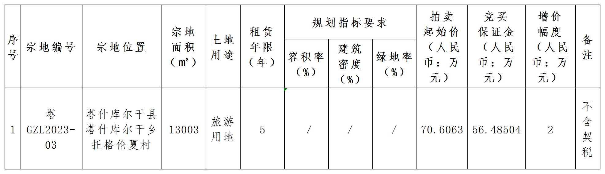 根據(jù)《中華人民共和國(guó)土地管理法》《招標(biāo)拍賣(mài)掛牌出讓國(guó)有建設(shè)用地使用權(quán)規(guī)定》(國(guó)土資源部令第39號(hào))《自治區(qū)深化公共資源交易平臺(tái)整合共享工作方案〉的通知》(新政辦函〔2019〕250號(hào))等有關(guān)法律法規(guī)及文件的規(guī)定,經(jīng)塔什庫(kù)爾干塔吉克自治縣人民政府批準(zhǔn),塔什庫(kù)爾干塔吉克自治縣自然資源局決定以拍賣(mài)方式租賃1(幅)地塊的國(guó)有建設(shè)用地使用權(quán)。并委托新疆國(guó)源土地礦產(chǎn)資源交易中心組織實(shí)施?,F(xiàn)將有關(guān)事項(xiàng)公告如下: