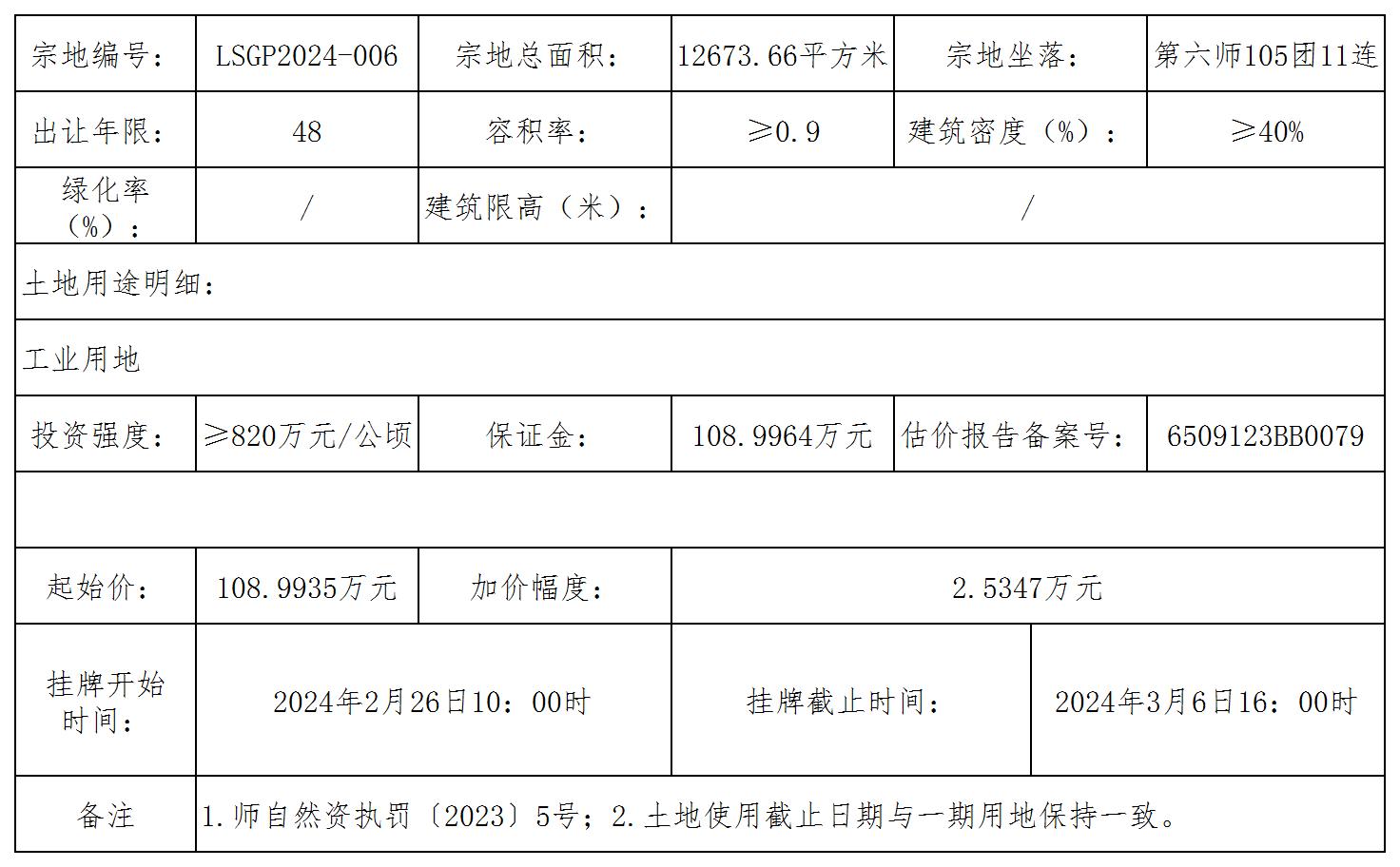 四、本次掛牌出讓的詳細(xì)資料和具體要求,見掛牌出讓文件。申請人可于2024年2月5日至2024年3月4日到兵團(tuán)公共資源交易中心第六分中心獲取掛牌出讓文件。