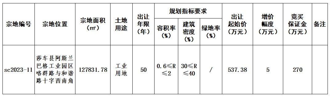 根據(jù)《中華人民共和國(guó)土地管理法》《招標(biāo)拍賣掛牌出讓國(guó)有建設(shè)用地使用權(quán)規(guī)定》(國(guó)土資源部令第39號(hào))、《自治區(qū)深化公共資源交易平臺(tái)整合共享工作方案〉的通知》(新政辦函〔2019〕250號(hào))等有關(guān)法律法規(guī)及文件規(guī)定,經(jīng)莎車縣人民政府批準(zhǔn),莎車縣自然資源局決定以掛牌方式出讓1(幅)地塊的國(guó)有建設(shè)用地使用權(quán)。并委托新疆國(guó)源土地礦產(chǎn)資源交易中心組織實(shí)施。現(xiàn)將有關(guān)事項(xiàng)公告如下: