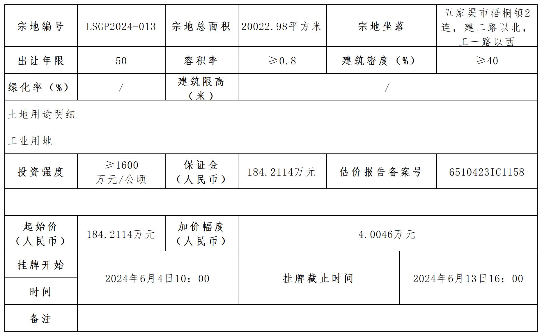六、本次國(guó)有建設(shè)用地使用掛牌地點(diǎn)為兵團(tuán)公共資源交易中心第六分中心。掛牌時(shí)間為:2024年6月4日10:00至2024年6月13日16:00。
