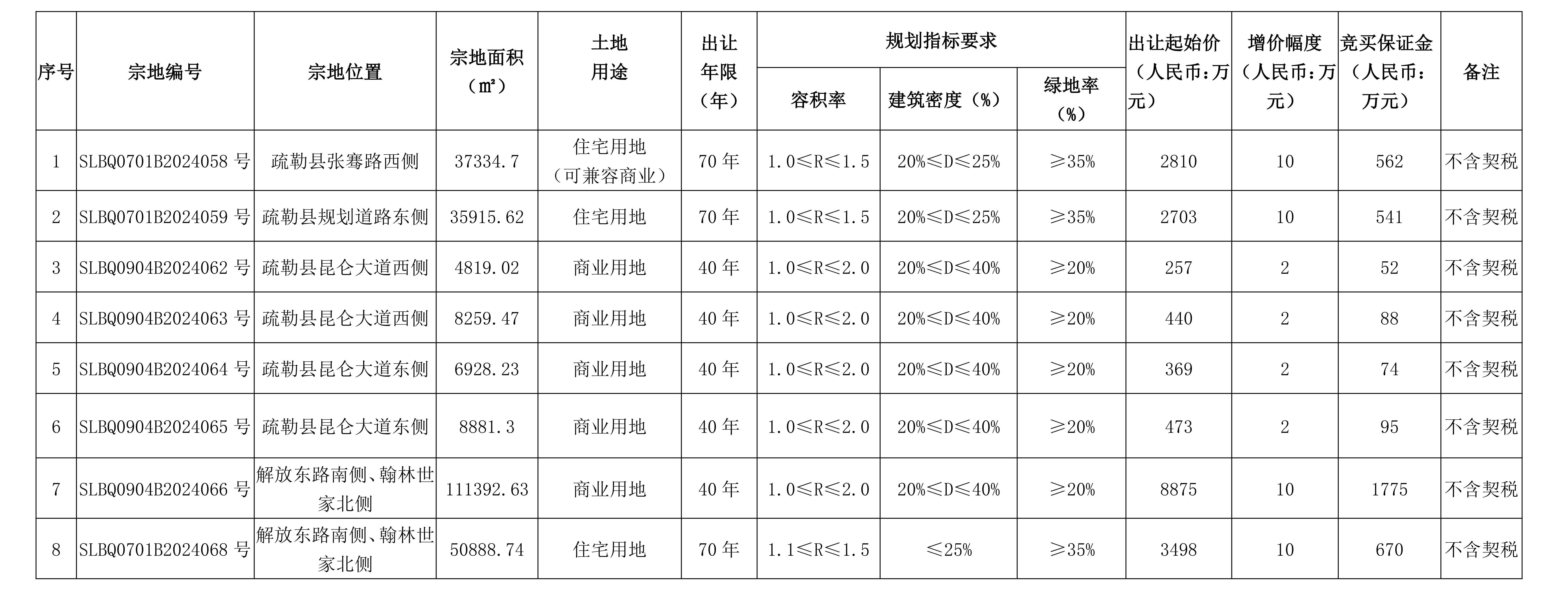 根據(jù)《中華人民共和國土地管理法》《招標(biāo)拍賣掛牌出讓國有建設(shè)用地使用權(quán)規(guī)定》(國土資源部令第39號)《自治區(qū)深化公共資源交易平臺整合共享工作方案〉的通知》(新政辦函〔2019〕250號)等有關(guān)法律法規(guī)及文件的規(guī)定,經(jīng)疏勒縣人民政府批準(zhǔn),疏勒縣自然資源局決定以掛牌方式出讓8(幅)地塊的國有建設(shè)用地使用權(quán)。并委托新疆公信拍賣有限公司、新疆國源土地礦產(chǎn)資源交易中心(有限公司)、新疆九鼎軒拍賣有限公司公開掛牌出讓,現(xiàn)將有關(guān)事項(xiàng)公告如下: