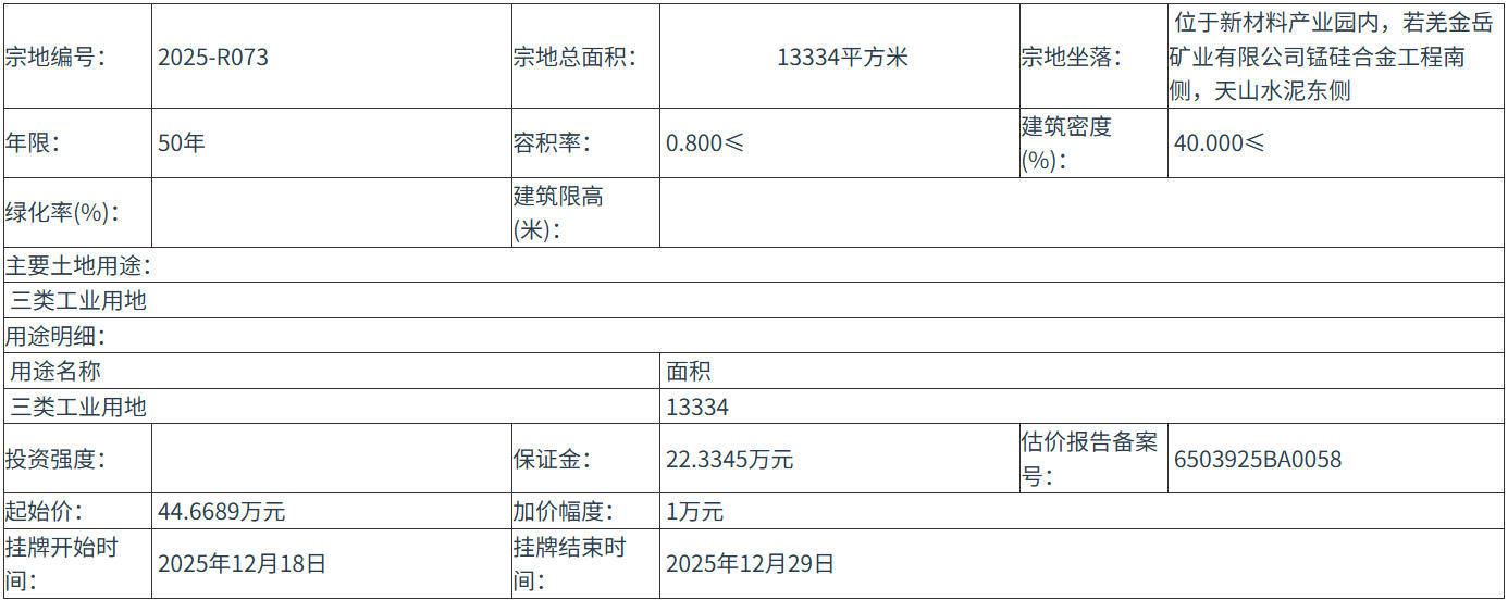 四、 本次掛牌出讓的詳細資料和具體要求,見掛牌出讓文件。申請人可于 2025年11月28日 至 2025年12月17日 到 巴州公共資源交易網(wǎng)(http://xjbzggzy.cn/) 獲取 掛牌出讓 文件。
